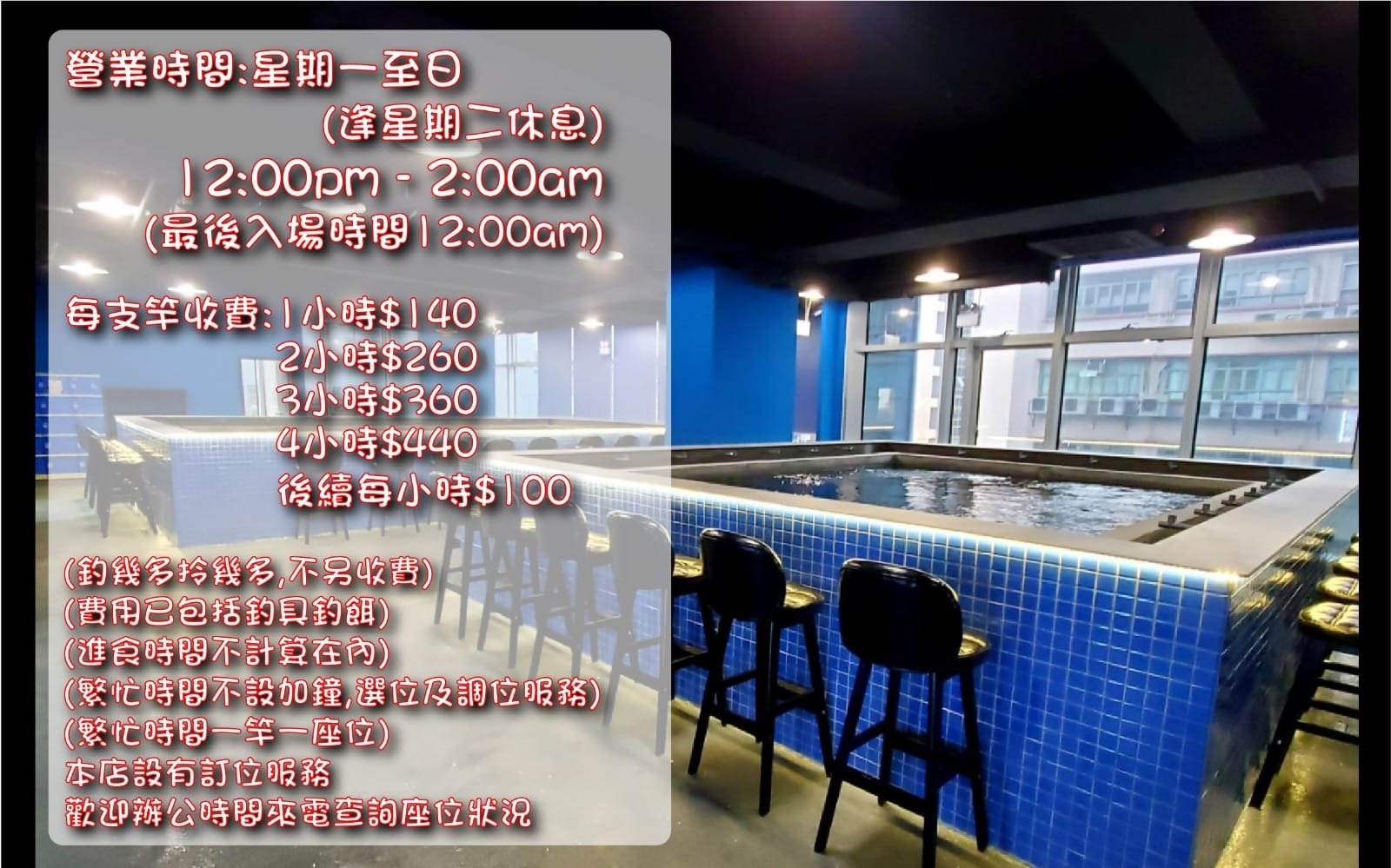 項目收費 (每支竿計算)​:一小時 $140;​兩小時 $240;​三小時 $330;四小時 $400;後續每小時 $100(費用已包括釣具及釣餌,燒蝦及用餐時間不計算在內)