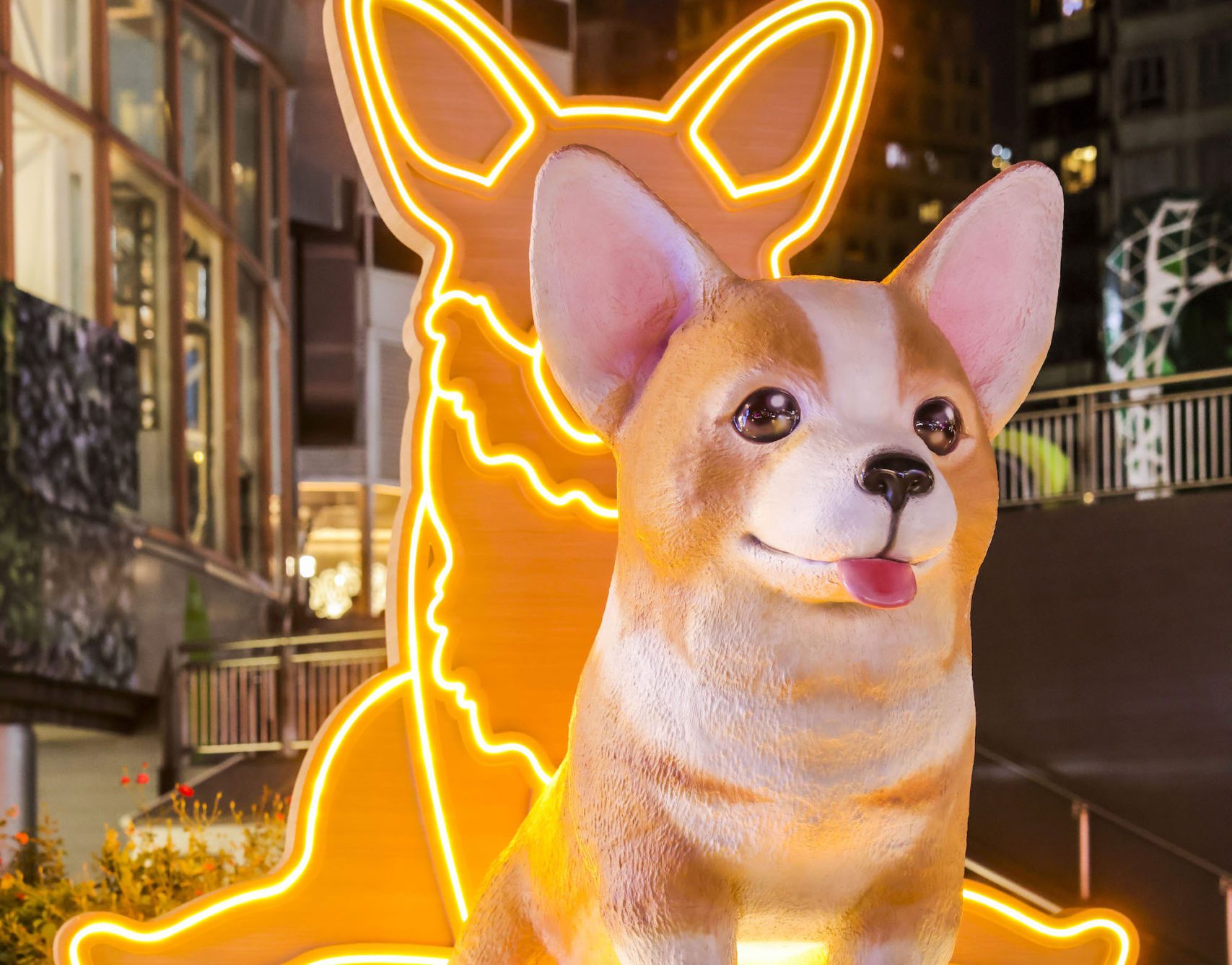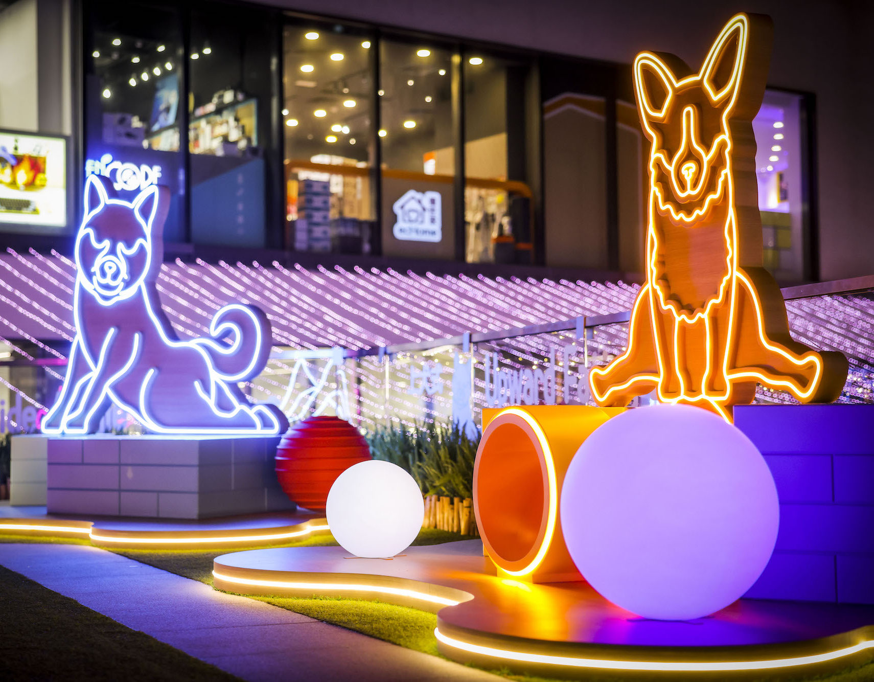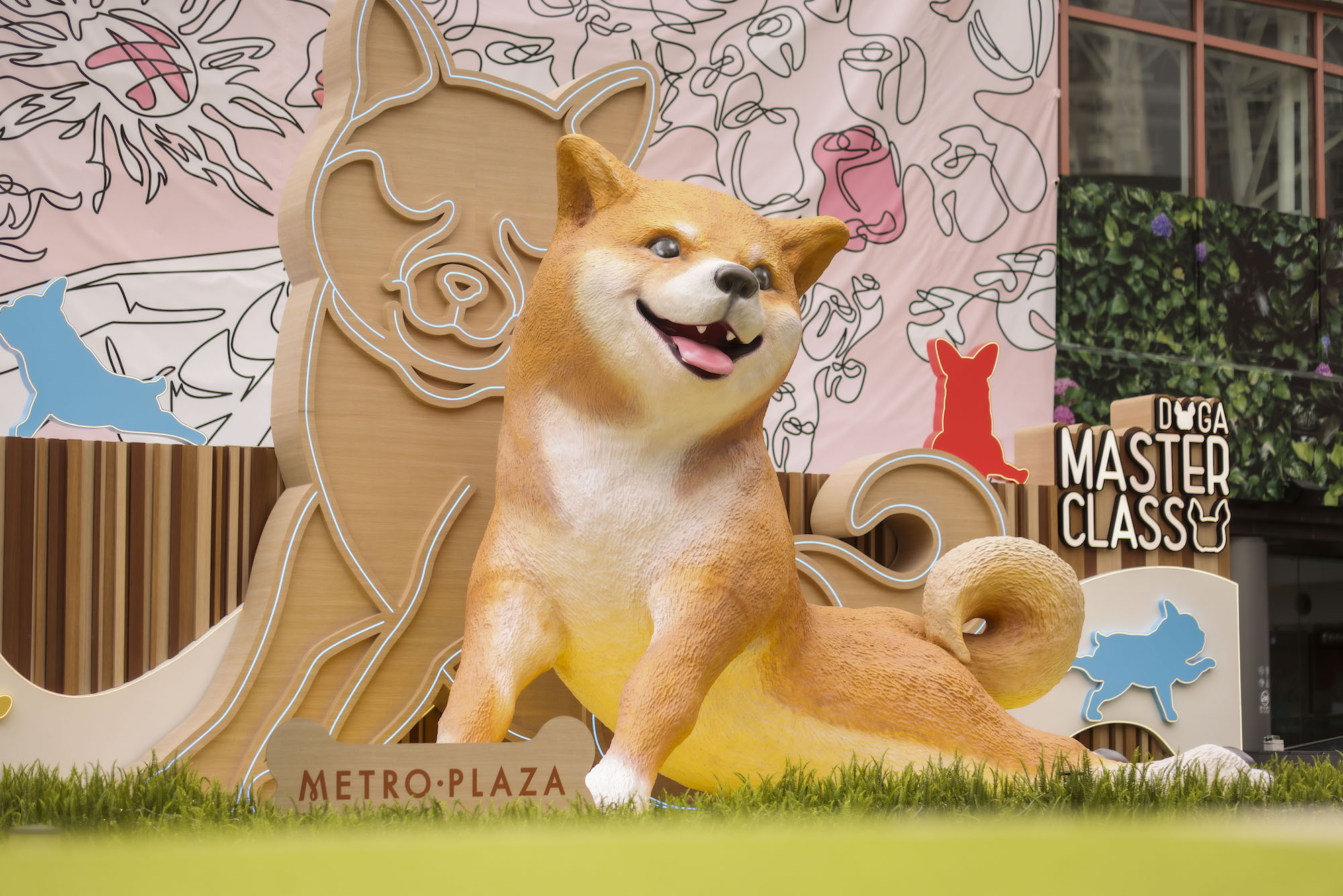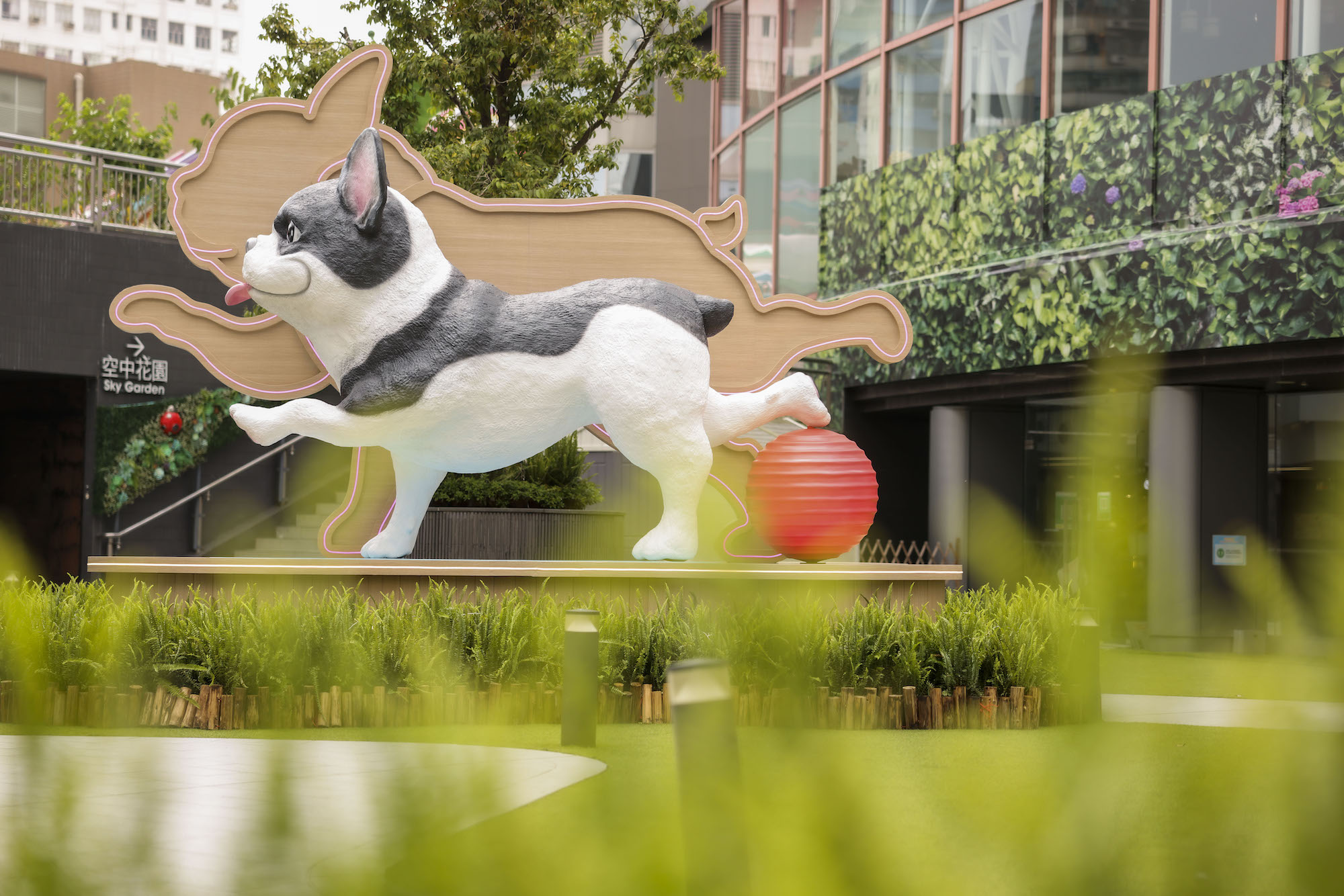 新都會廣場「DOGA大師班」設5大狗狗打卡位,相信最吸引小朋友的就是「4米高巨犬柴柴」,柴犬伸展四肢練習瑜伽,外表精靈可愛;「圓滾滾法鬥」單腳踏在瑜伽球上展現平衡力;「小短腿哥基」坐在瑜伽輪前表演一字馬;樓梯間的「空中瑜伽法鬥」懸吊半空,展現瑜伽才能。到了晚上,各個巨型犬身後裝有燈管的巨型立牌更會亮燈,小朋友可在「夜光空中平台」與霓虹巨犬齊齊合照!