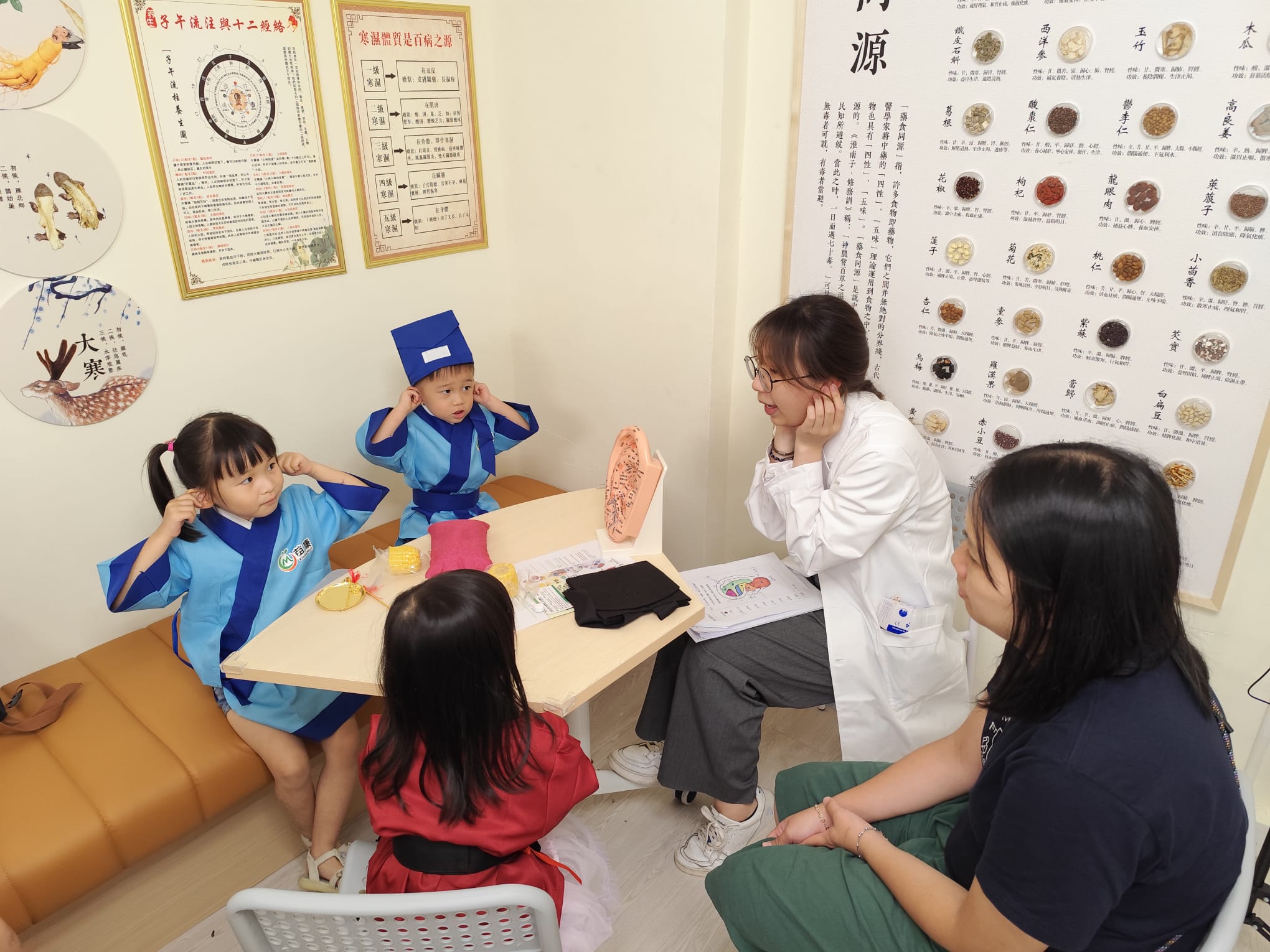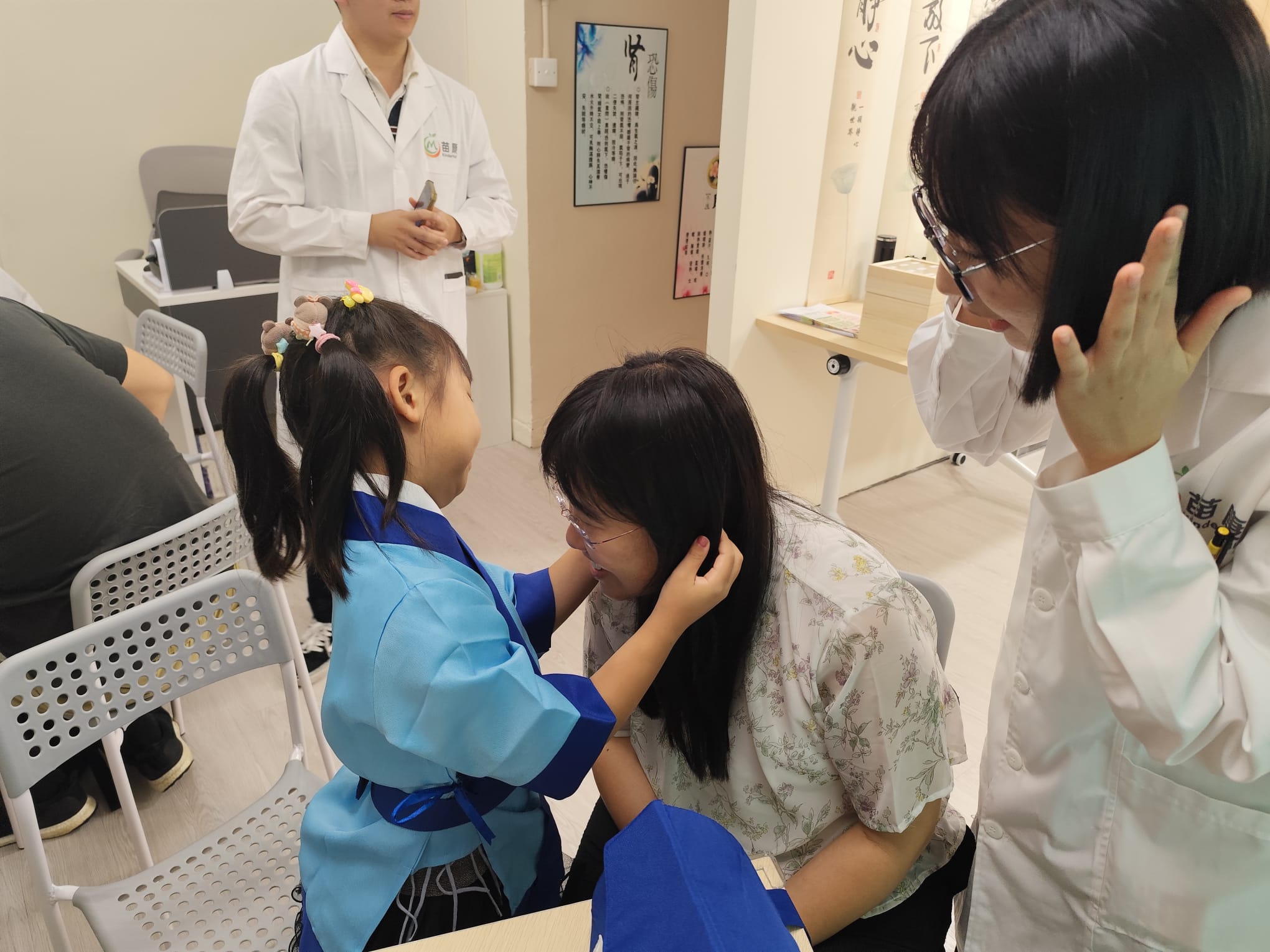 苗康中醫生活體驗館早前推出「新世代小中醫活動」,小朋友可以了解由中醫師分享中醫小知識,包括望聞問切、神奇耳穴、體驗小兒推拿、辨草藥、做香囊、執醫沖劑等。小朋友齊齊穿上特色古裝或現代醫生袍,變身新時代小中醫,可以啟發他們對中醫藥文化的興趣。