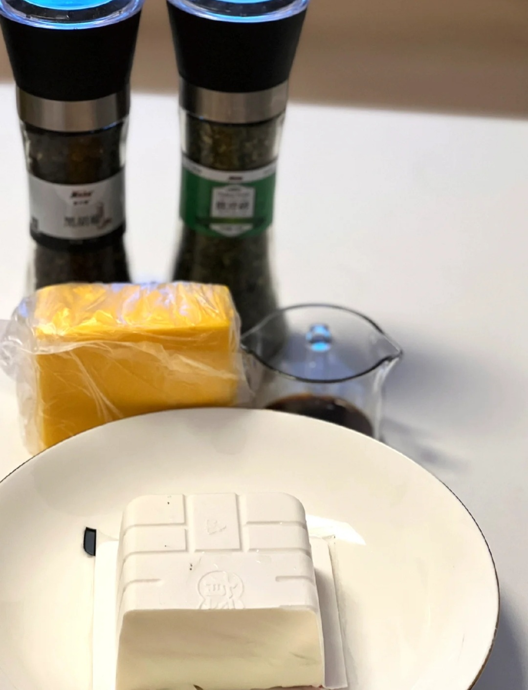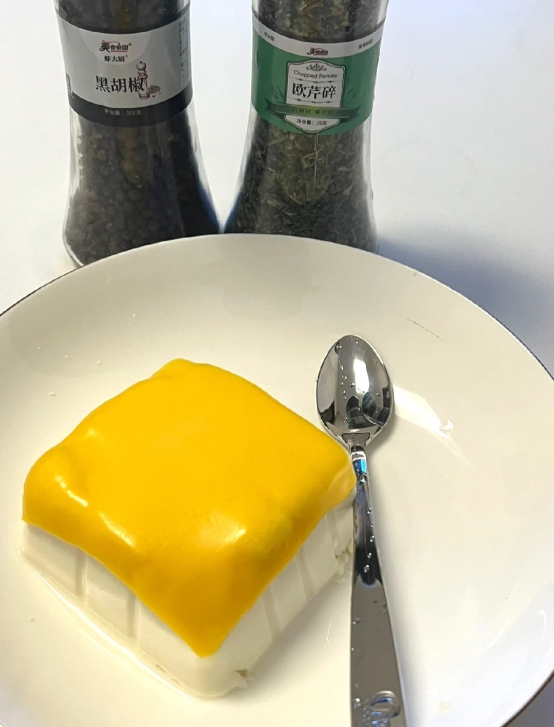 - 豆腐上放一片低卡芝士,放入微波爐以高火叮1分30秒