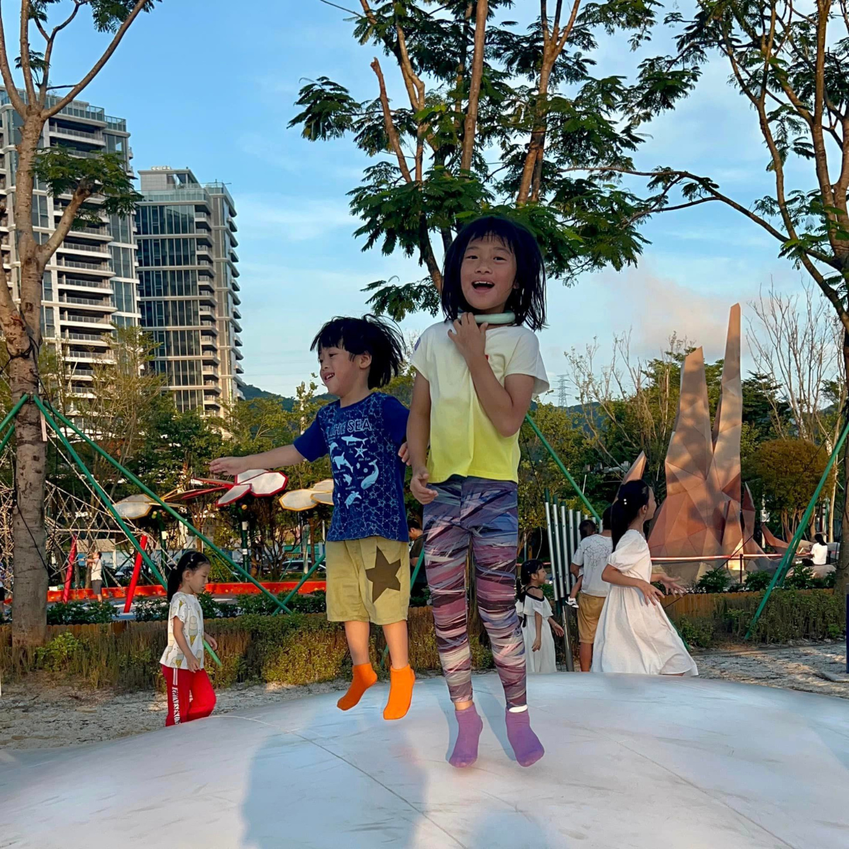 公園設有一片300平米的跳跳雲彈床,鋪在地上造成多個不同高度的山丘,質地柔軟而小朋友一彈一跳也不會受傷,在跳之餘還能聽到不同樂器的音樂 彈床外面有一圈沙池,喜歡玩沙的小朋友記得提前帶備玩沙的工具。