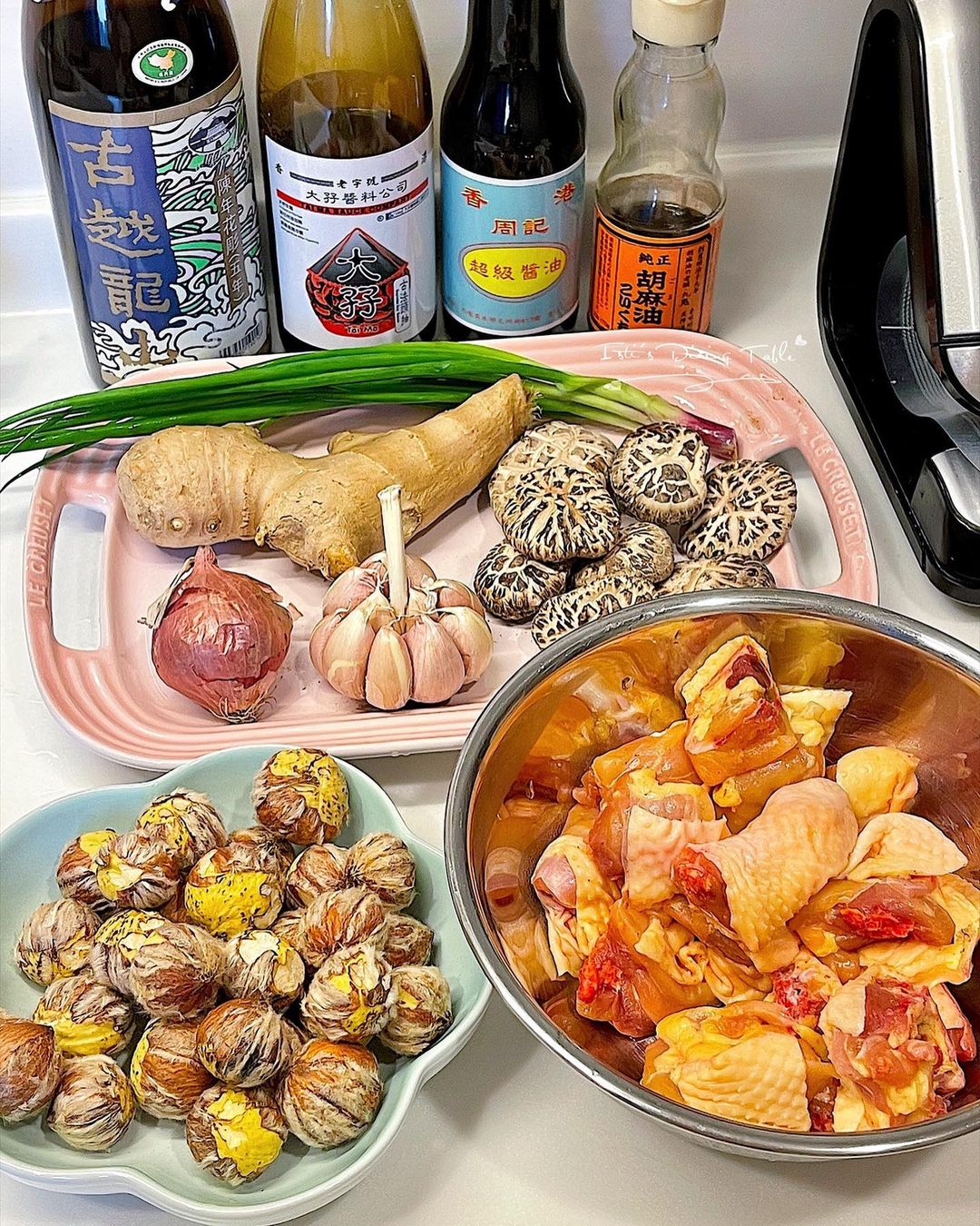 調味料:花雕紹興酒 1湯匙、冰糖 1小粒、蠔油 3湯匙、生抽 2茶匙、老抽 1茶匙