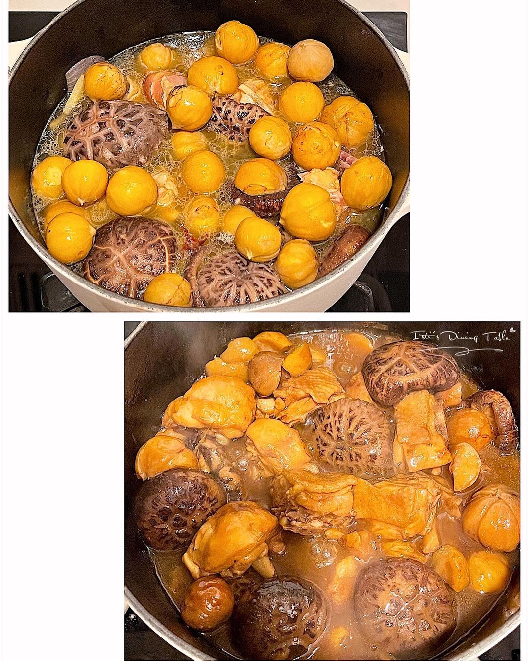 5. 倒入浸冬菇水,加入冬菇、栗子和其餘調味料,中火煮沸後,合蓋小火煮45分鐘。