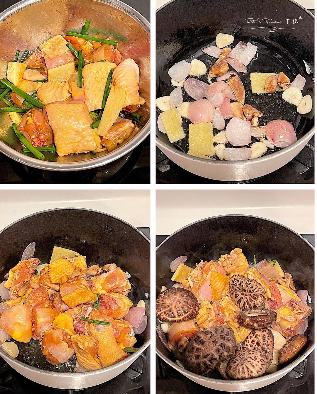 4. 下油開鍋,加入冬菇蒂、薑片、蒜片和乾蔥炒香,然後下雞件拌炒,灒入花雕紹興酒,加入冰糖炒至溶化。