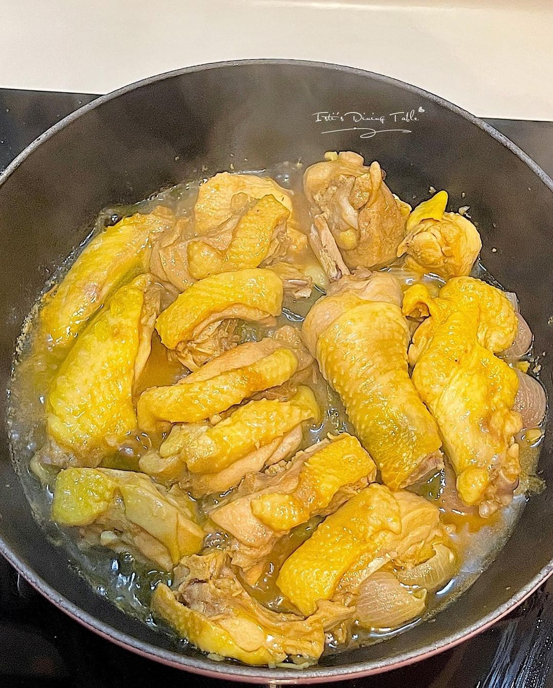 3. 加入雞件,中火煎至表面焦香,加入冰糖碎炒勻;下醬油和米酒,煮至沸後合蓋小火煮10分鐘。