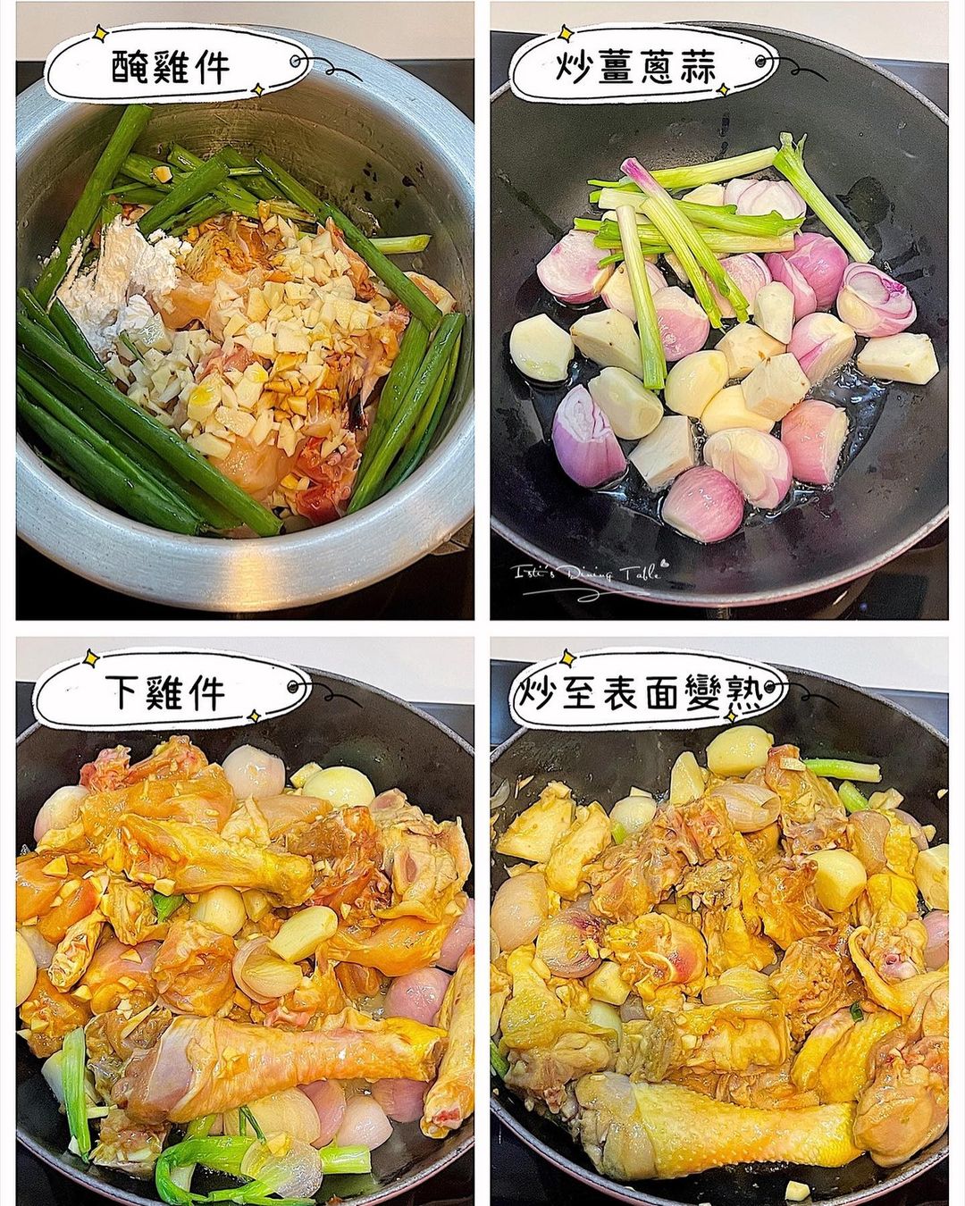 2. 下油開鍋,爆香沙薑、蒜粒、乾蔥和蔥白,放入雞件炒至表面變熟,盛起備用。