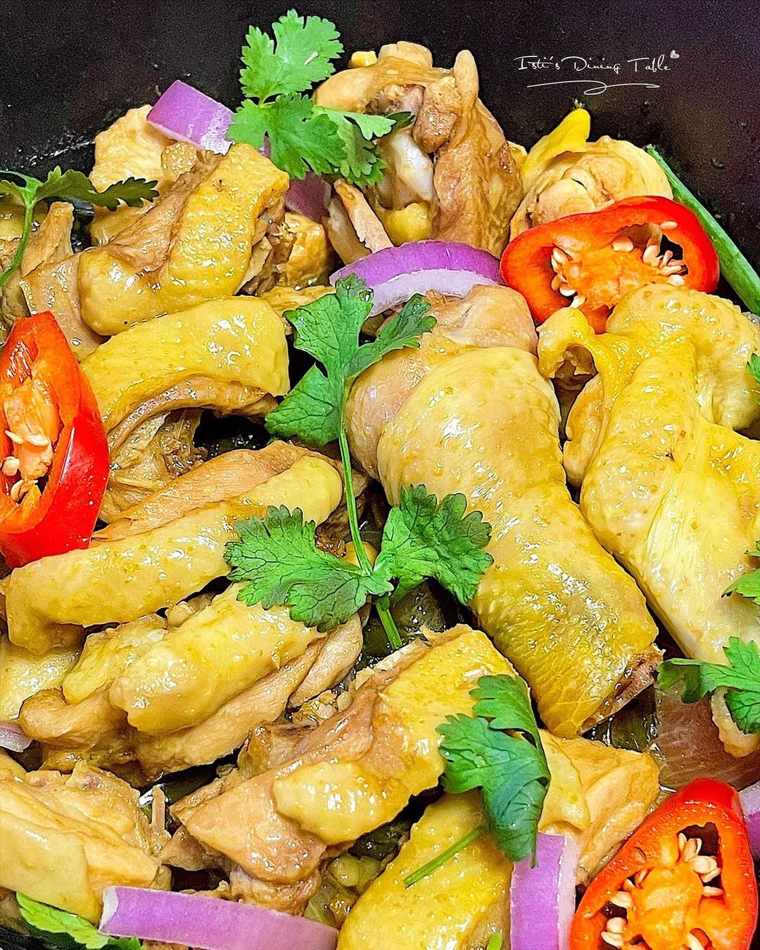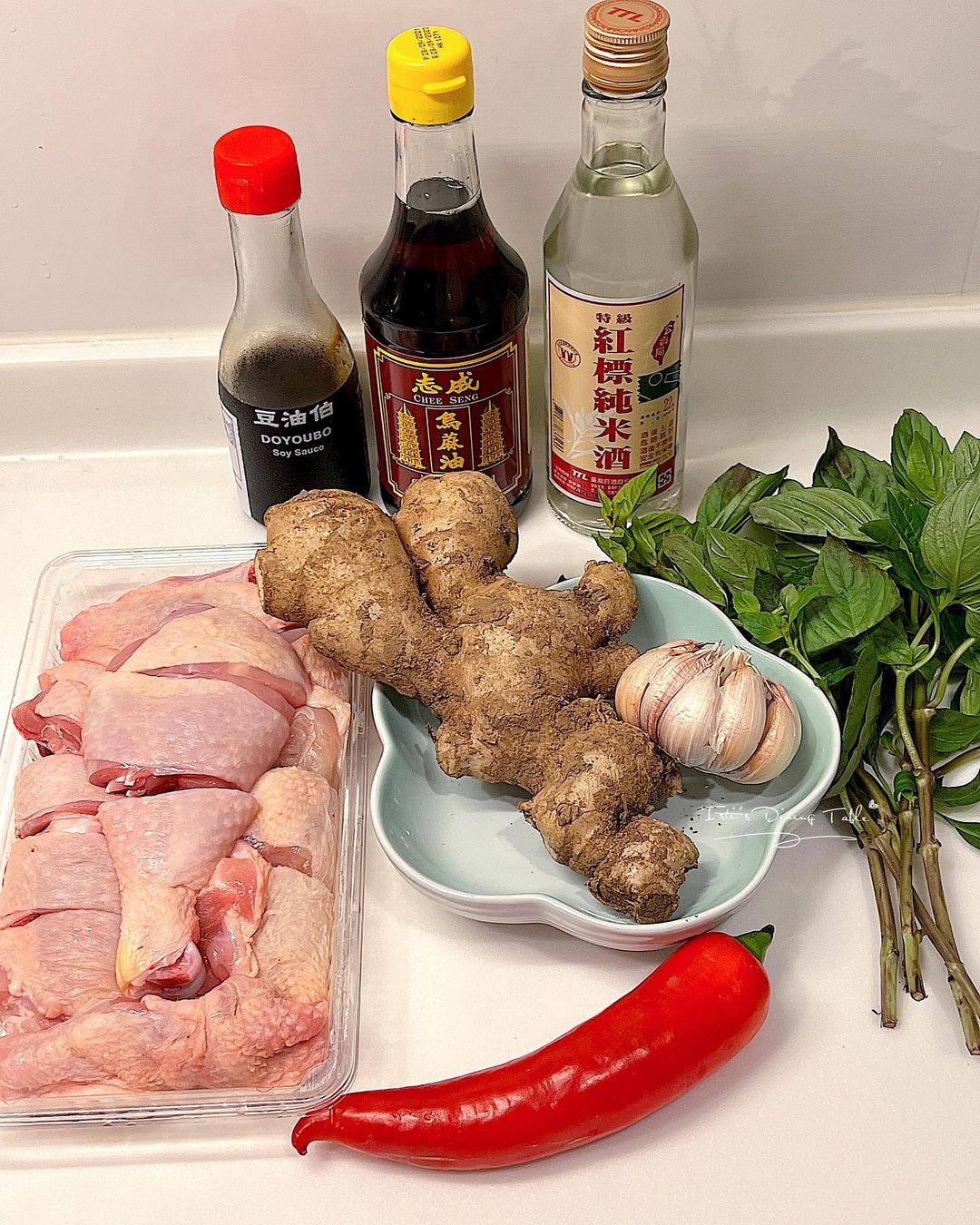 材料:帶骨雞件 650g、薄薑片 35g、蒜頭 5粒、麻油 30ml、醬油/ 生抽 30ml、米酒 50m、冰糖 1-2茶匙、九層塔/羅勒葉 2棵、紅尖椒 (可省略)