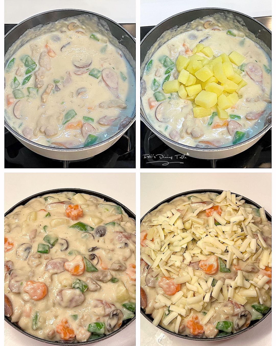 材料:去骨雞脾肉 300g去皮切粒、甘荀 1條切粒、薯仔 1個切粒、蘑菇/ 香腸 / 荷蘭豆 切粒、洋蔥 1/4個切粒、鮮牛奶 500ml、芝士碎 70g
