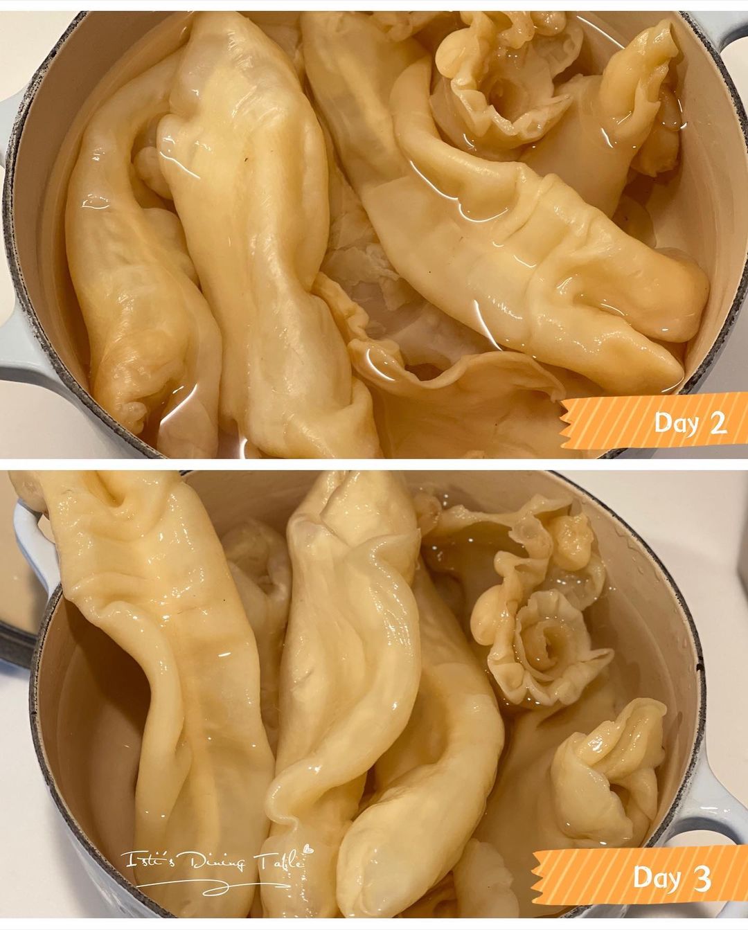1. 浸發花膠:花膠不用清洗,直接放上大碟,淋上1茶匙米酒蒸約8分鐘;放入清潔無油的容器,用清水放雪櫃浸發3晚,每天更換清水一次,放冰格保存。