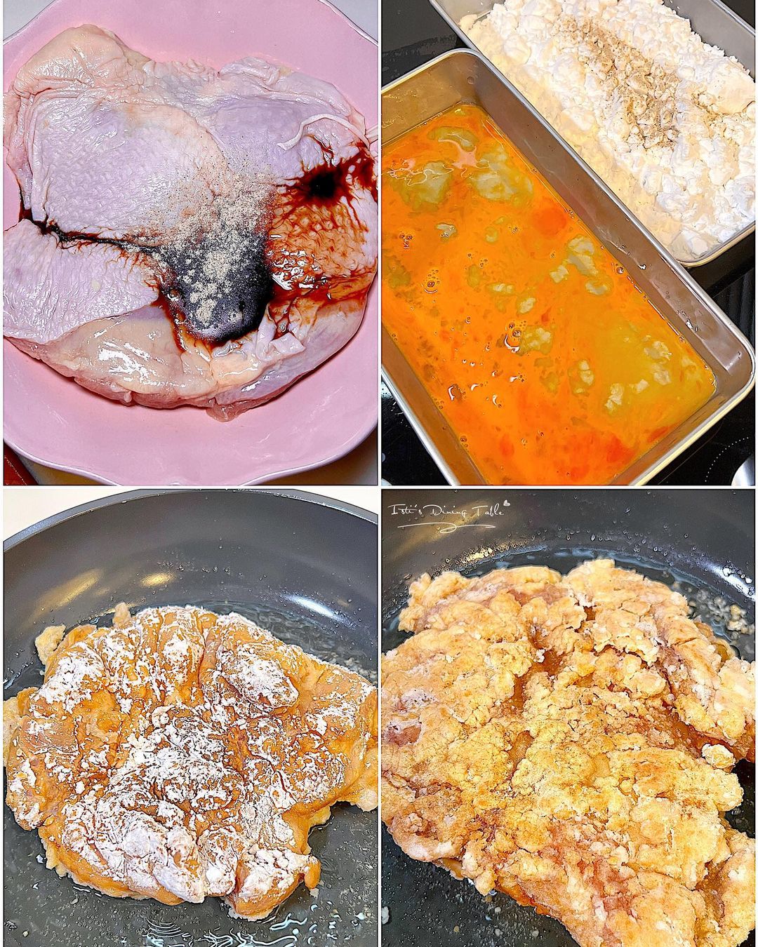 2. 預備蛋液和生粉各一盤,生粉混入胡椒粉增加香味;雞扒沾上蛋液,然後拍上生粉;再沾上蛋液,拍上生粉壓實至乾身。