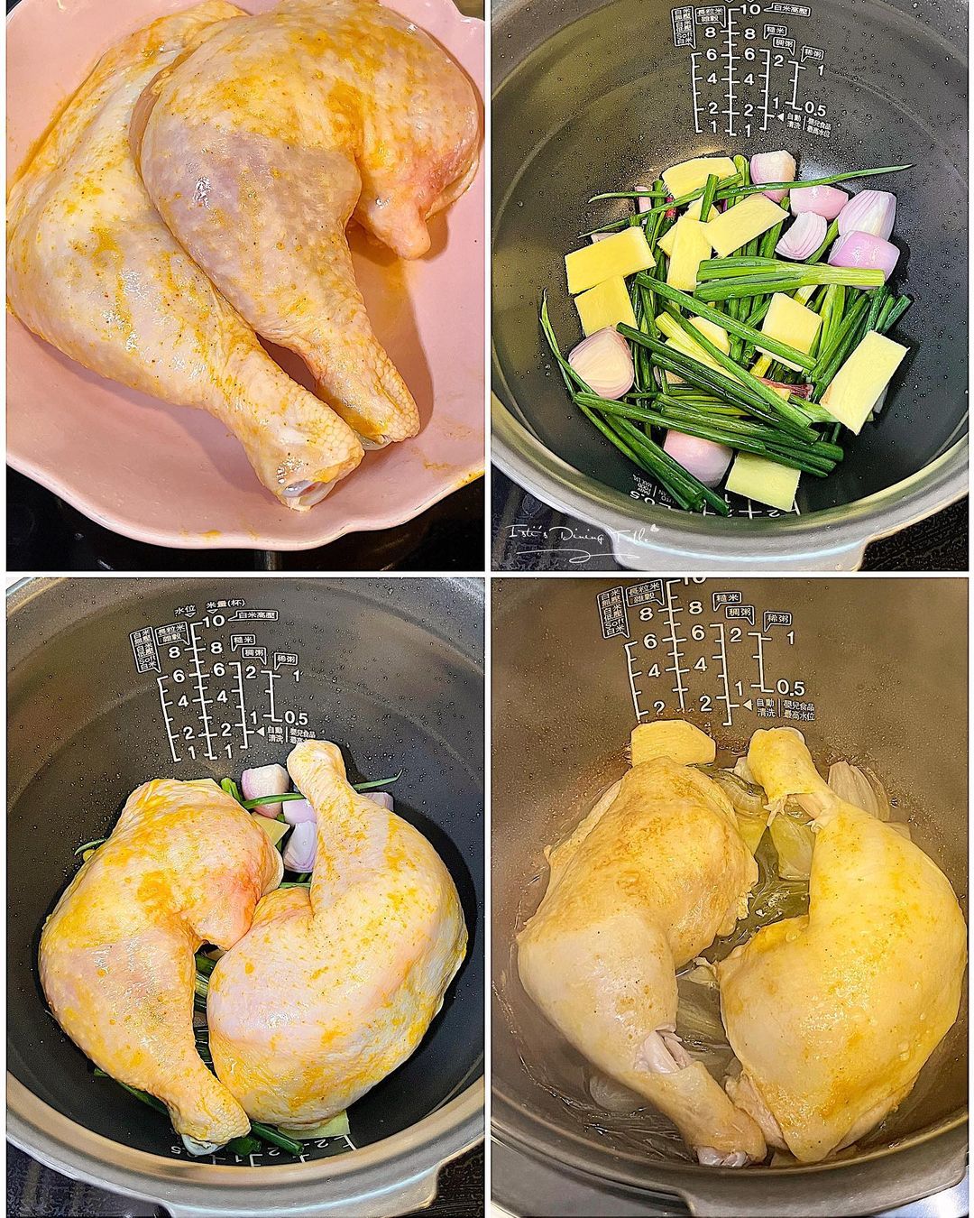 2. 乾蔥、薑片和蔥段放入電飯煲,鋪上雞髀,按下煮飯按鈕煮熟。