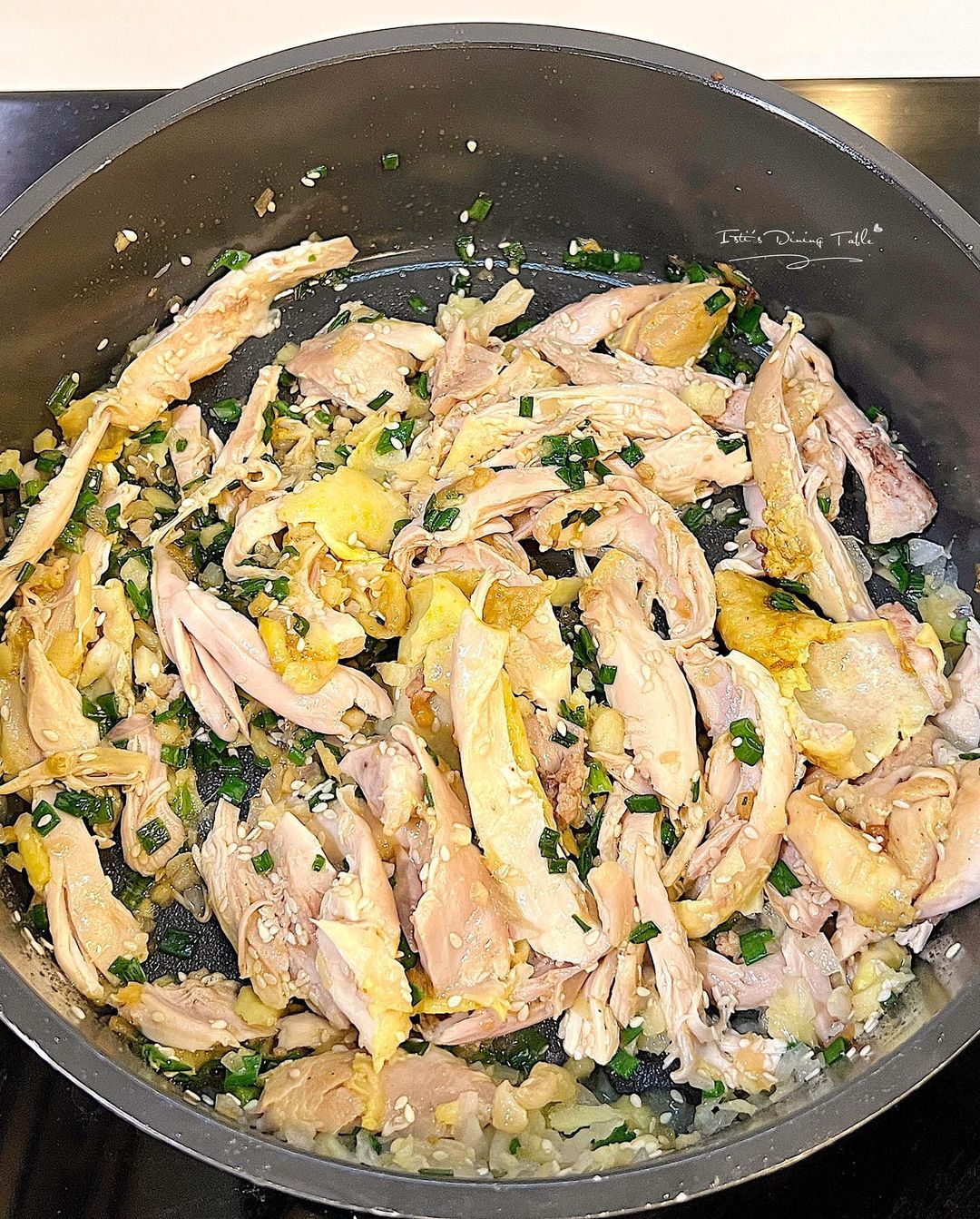 4. 下油開鍋,炒香乾蔥碎和薑蓉;加入蔥粒,下調味料試味;拌入雞肉和白芝麻即成。