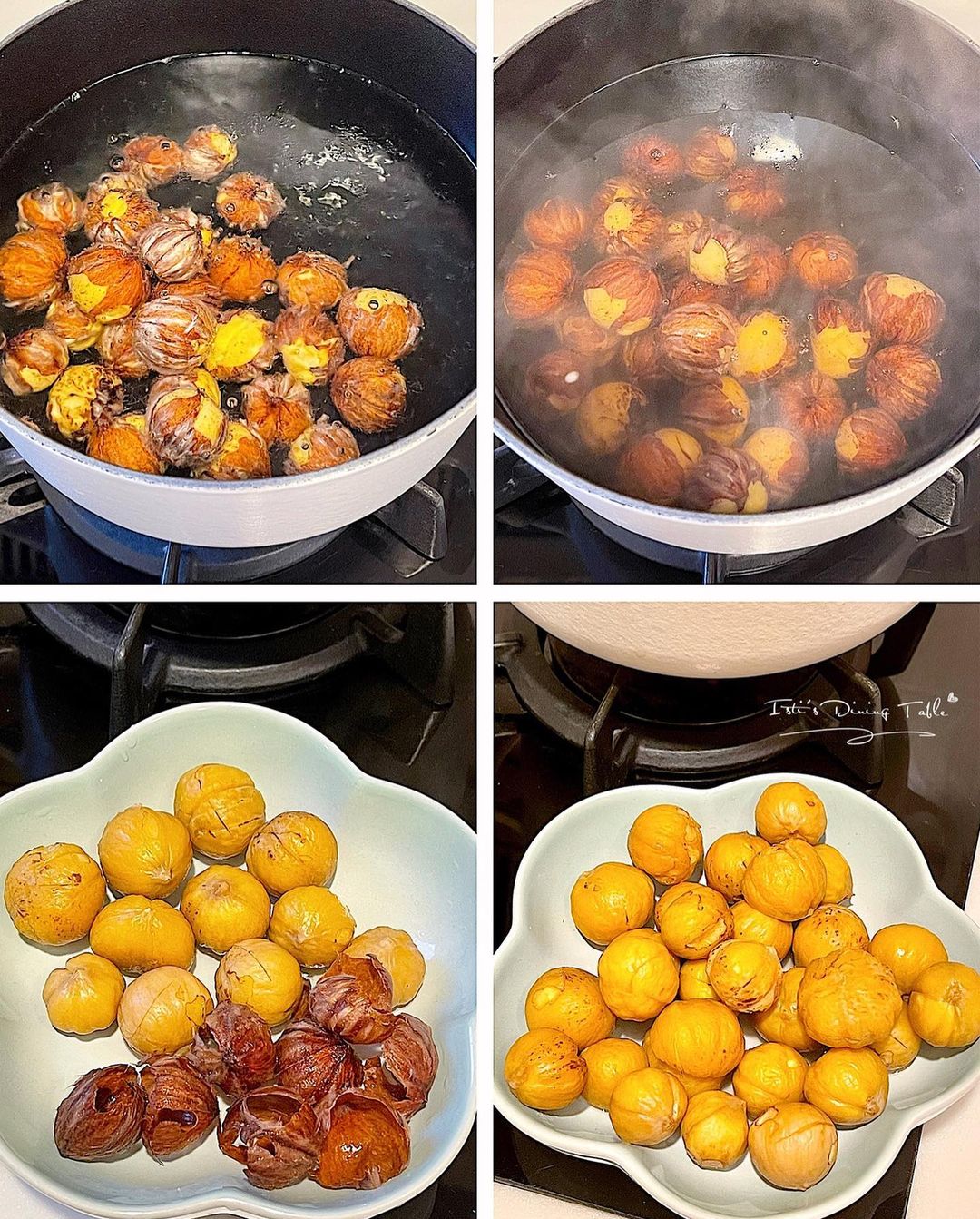 - 大鍋燒熱水,放入栗子煮2分鐘,再合蓋焗5分鐘,趁熱去皮。