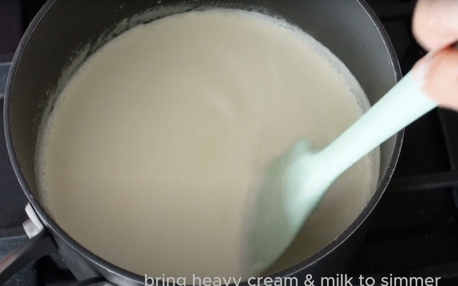 7. 奶液加熱:牛奶、鮮奶油倒入鍋中,加入砂糖,小火加熱攪拌至融化