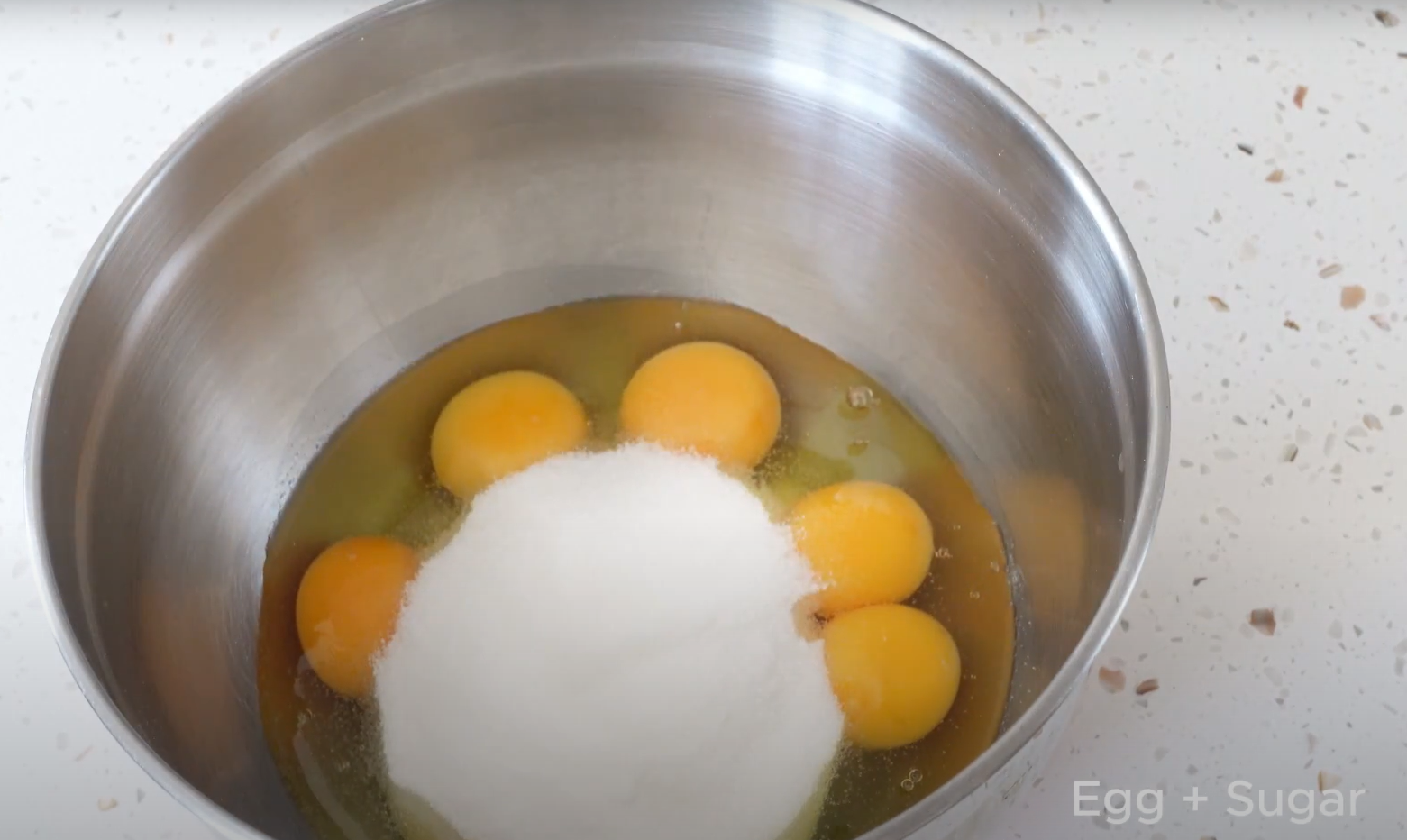 2. 在大碗內加入雞蛋、蛋黃和糖,拌勻