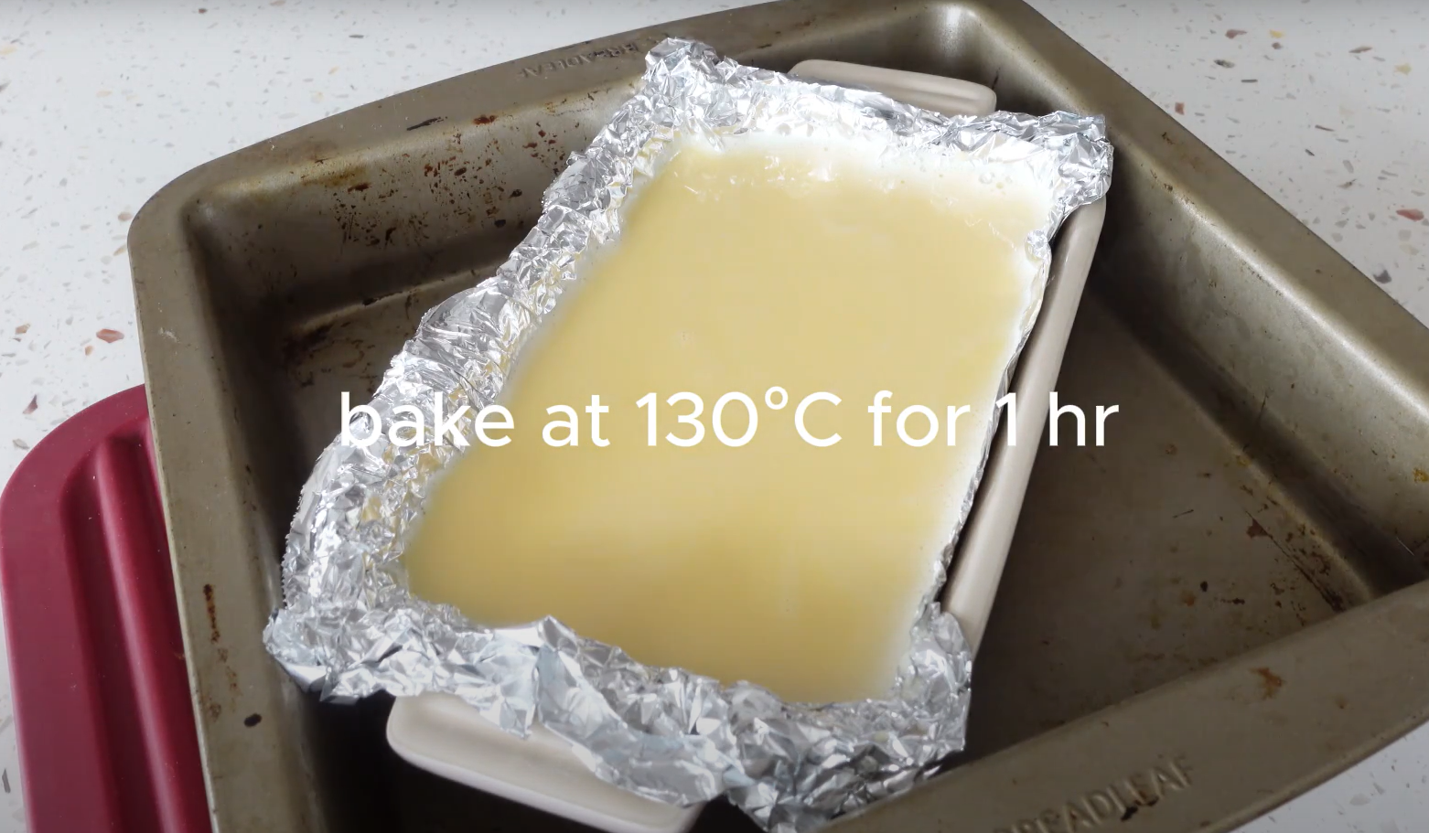 5. 將烤盤放入大盤內,倒入熱水至1/3烤盤高度,放入已預熱130C焗爐,焗約55分鐘至一小時