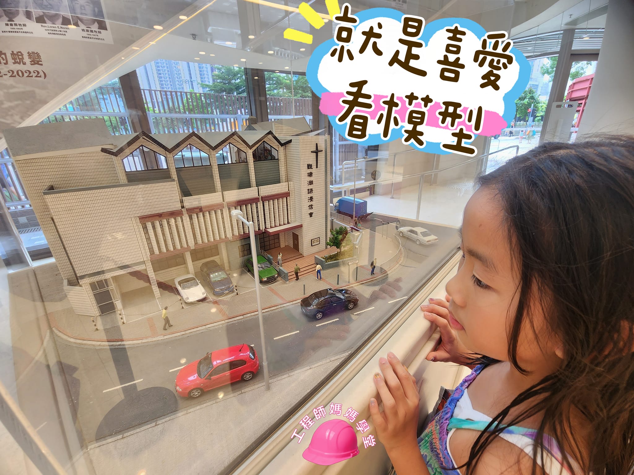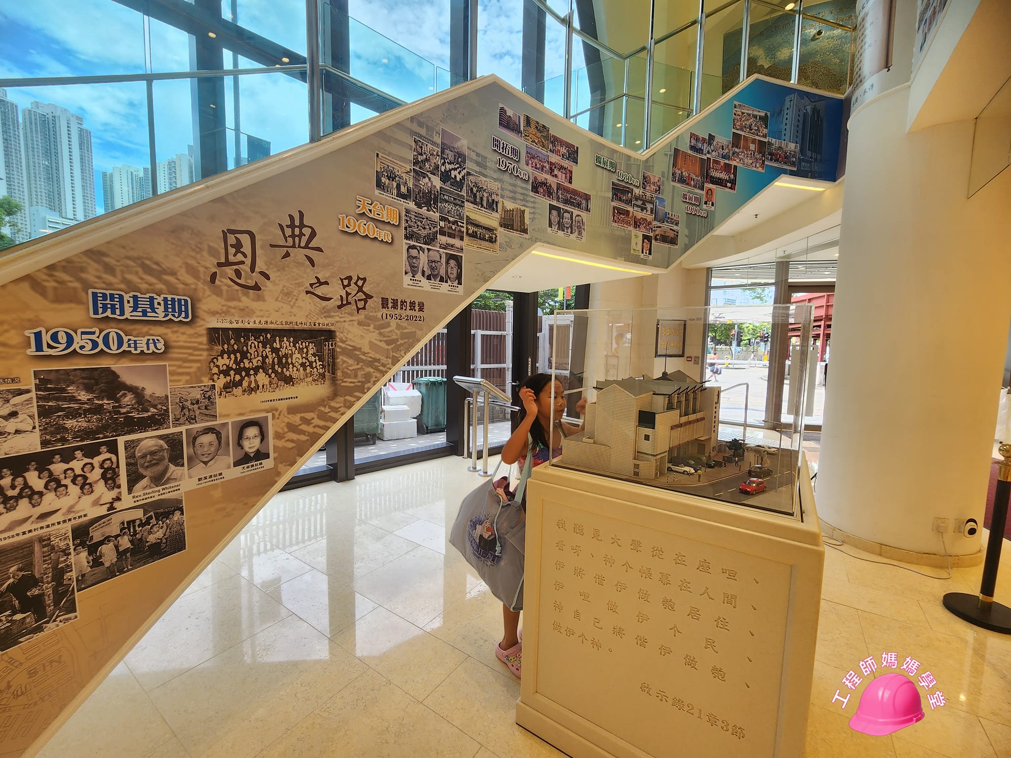在地下大堂,有中心的建築模型,還展示了建築物內的模擬環境,自小跟我四處看模型的大女兒,看得津津有味,像是快要被吸進去成為小人偶的一員。而接駁上一樓餐廳的樓梯側身展示了中心在香港多年的發展史,女兒也能指出早前參觀美荷樓生活館所了解到的天台學校情況。