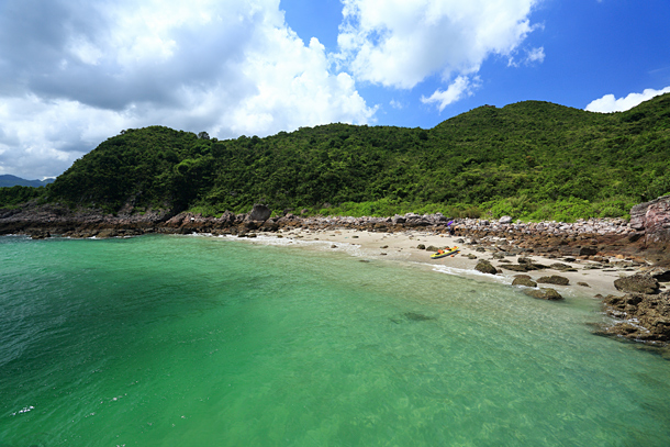 位於西貢區橋咀洲南面,彎月形海灘風光如畫,水清沙幼,又名「半月灣」,堪稱全港最美沙灘!海水藍得不像屬於香港,甚至被網民譽為「香港的馬爾代夫」。它而且沖身設施齊全,灘後還有燒烤場、草地等,極受歡迎。唯一缺點是交通較不方便,要先坐車到西貢碼頭,再轉乘街渡才能到達。