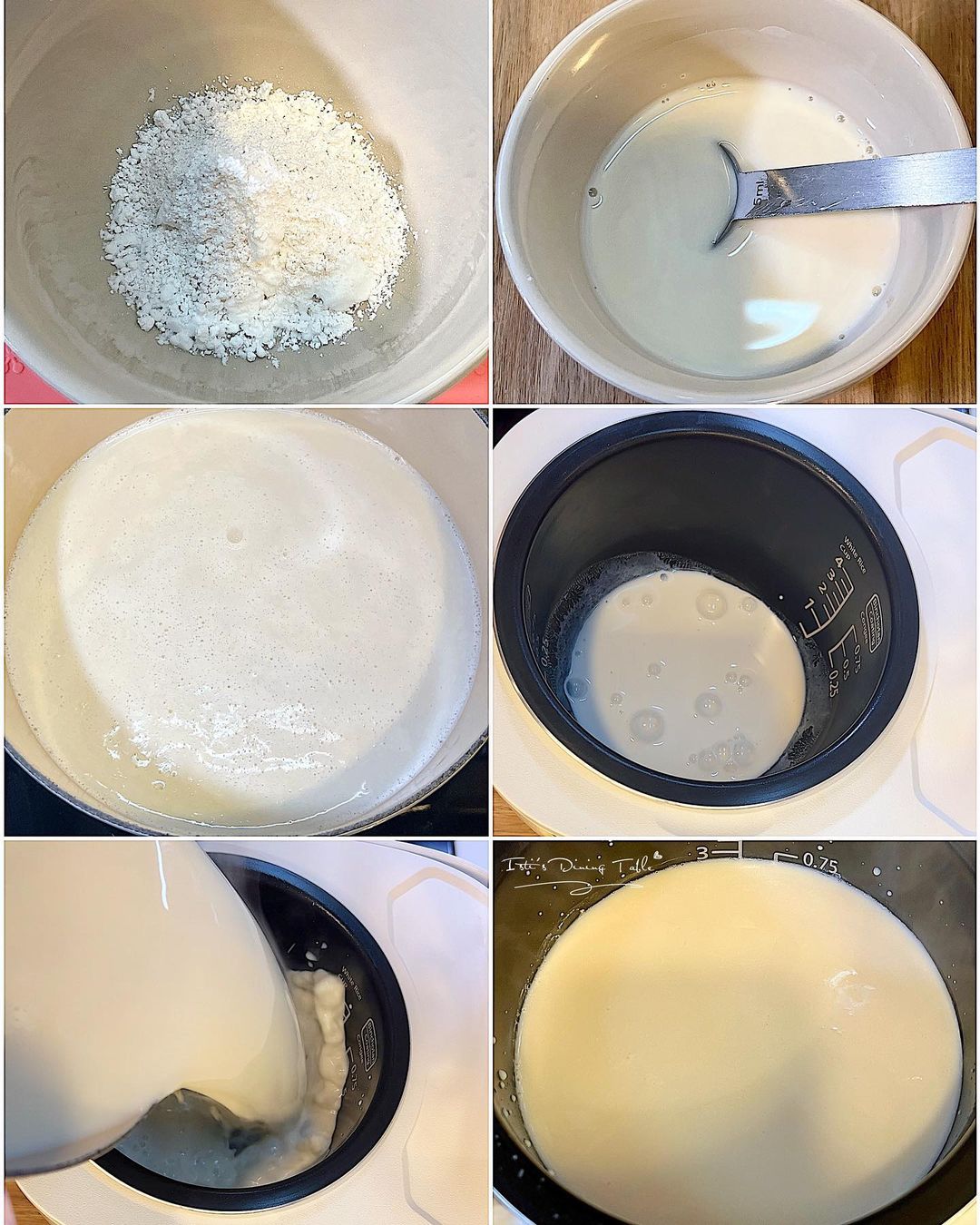 - 將步驟2的粉漿倒入電飯煲,再次攪拌避免粉末沉底;將熱豆漿由高處(30cm)倒入電飯煲;表面泡沫應該會自行消失,如仍有泡沫,可用匙羹移除。