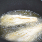 - 用中火將食用油加熱到170 °C後加入雞塊油炸2分鐘。