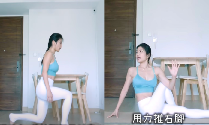 - 前後腳站,慢慢下去,前後腳都呈90度,再拉起並挺直上身,每邊腳做10下。