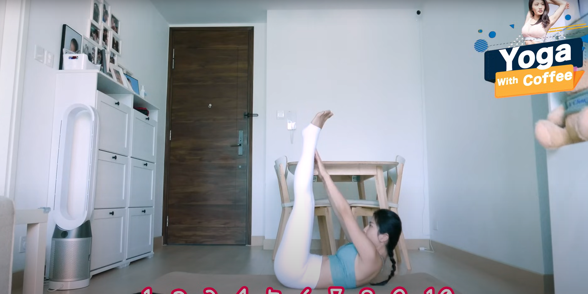 - 雙手向前伸碰到左邊和右邊小腿,做10下。