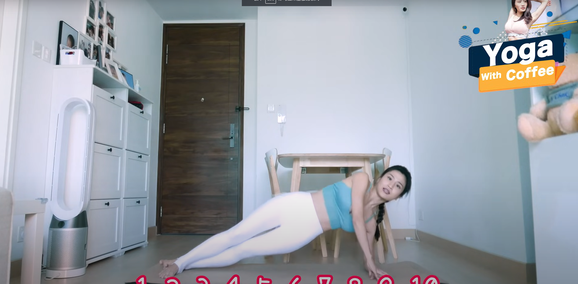 - 做平板支撐,身體呈直線,呼氣時腰向內收起,吸氣時下來,做10下。