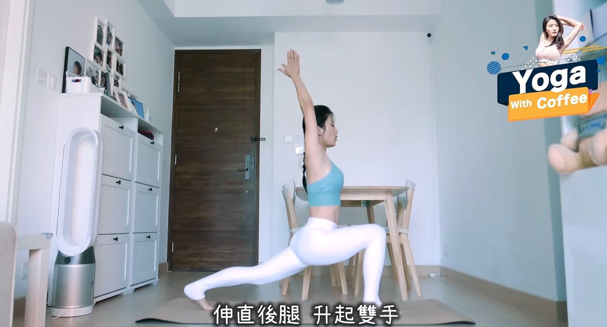 - 接著腳尖貼在地板,腳踭升起蹬直,伸直後腿,升起雙手,保持10個呼吸,換另一腳再做。