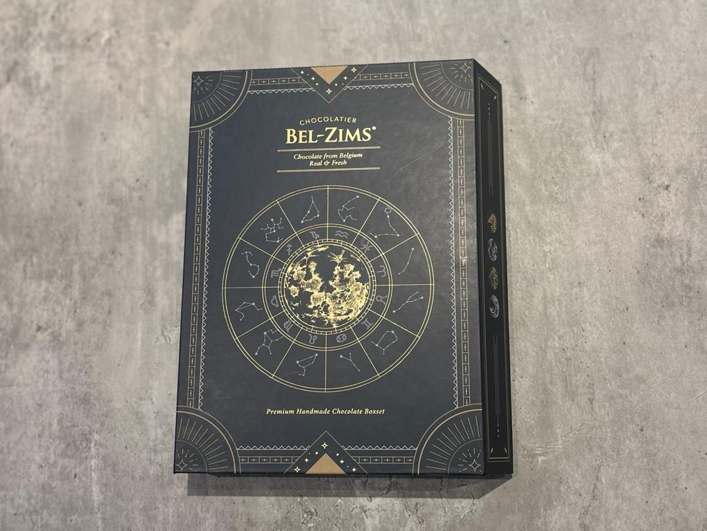 Bel-Zims是本地製作比利時手工朱古力的品牌,今年聖誕節推出「星座傳情朱古力禮盒」,禮盒打開時裡面的象徵12星座的燈泡會亮燈,彷似夜空的星星,精緻華麗。禮盒按12星座的不同屬性劃分4大區域,分別是「火象星座」、「土象星座」、「風象星座」、「水象星座」,並根據12星座系列基本性格設計12款獨特口味的朱古力。