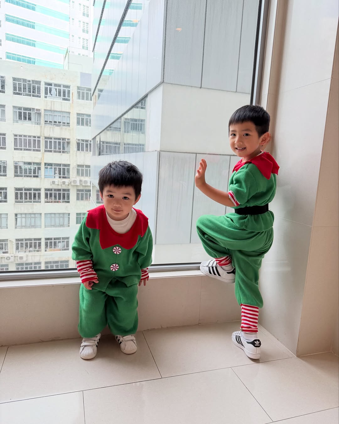 倪晨曦(Elva)每逢節日都喜歡幫仔仔打扮一番,今年聖誕就讓Virgil、Evren化身聖誕老人!最特別的是一反常態,穿著一身綠色的聖誕老人服裝,另外還用了彩帶當手環點綴,別有巧思。