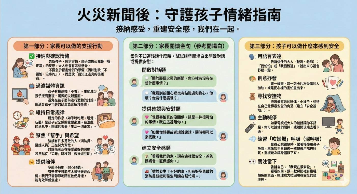災難如火警會帶來巨大創傷,影響成人及兒童的心理健康。及早介入可減低長期影響,如創傷後壓力症(PTSD)。以下是實用建議,參考香港及國際指引: