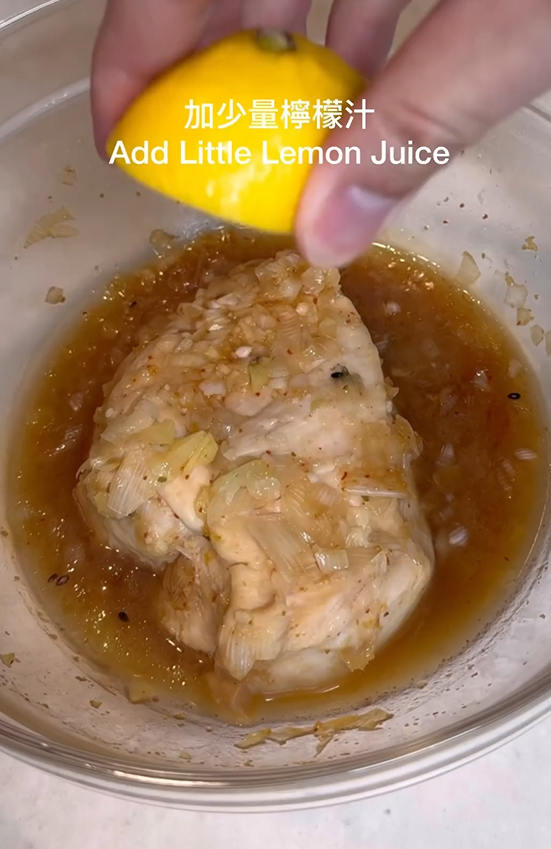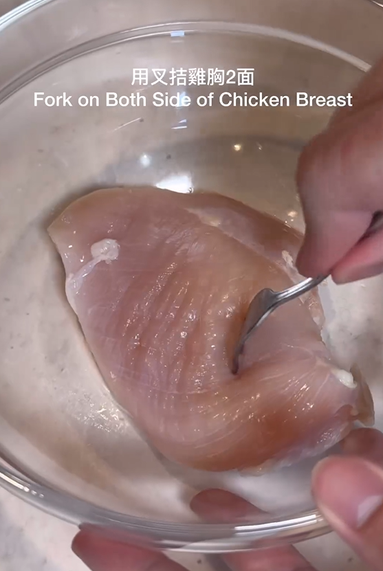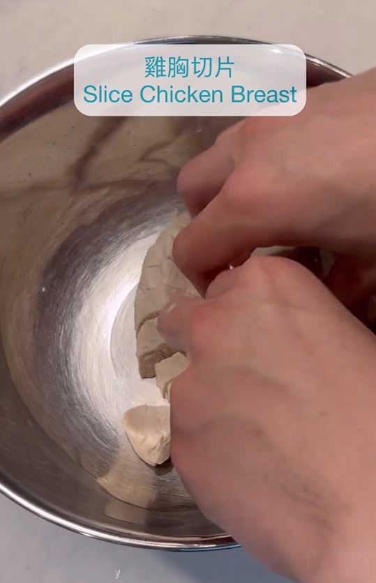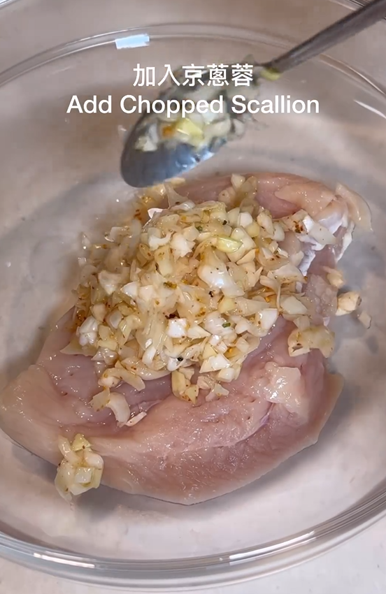 - 雞叉燒:用叉拮雞胸2面後,加入京蔥蓉