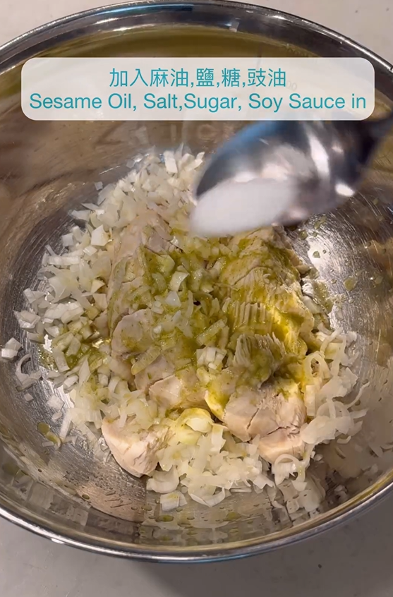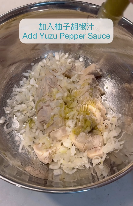 - 熟雞胸切片後,加入京蔥碎、柚子胡椒汁、麻油、鹽、糖、豉油撈勻