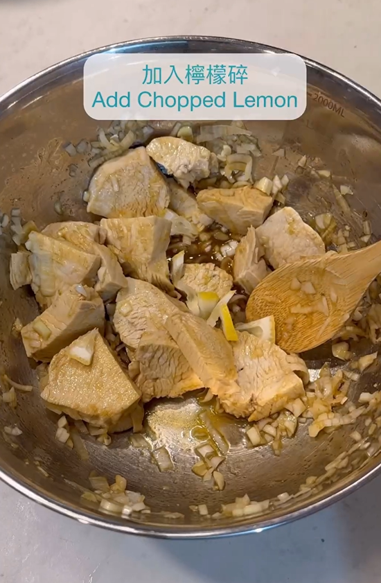 - 加入檸檬碎,再鋪上煮熟的烏冬