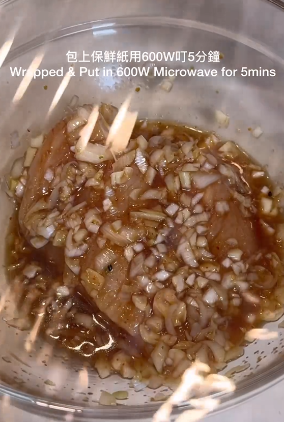 - 再加入[醬汁]後,包上保鮮紙用600W叮5分鐘