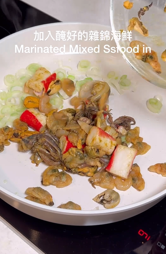 - 海鮮雜錦解凍後印乾水份醃30分鐘