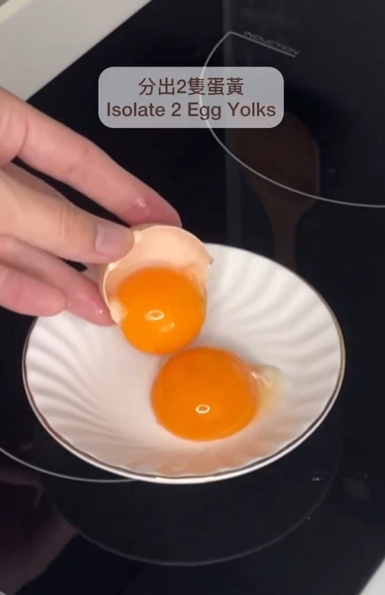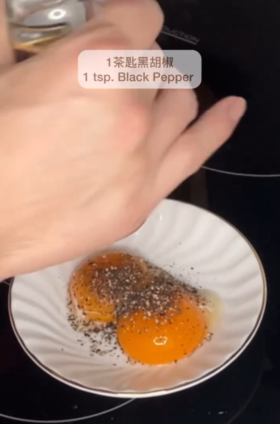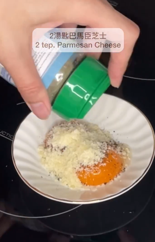 - 分出2隻蛋黃,加入1茶匙黑胡椒、2湯匙巴馬臣芝士後撈勻