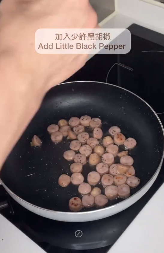 - 加入半茶匙鹽及黑胡椒炒至乾身