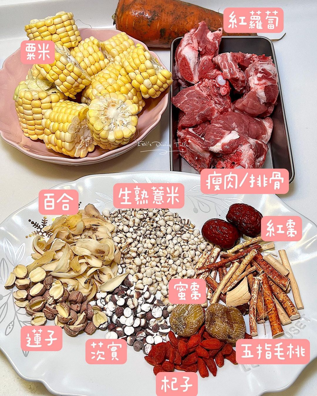 - 除杞子和紅棗外,全部材料放入大鍋,煮沸後合蓋小火煮1.5小時;加入杞子和紅棗,繼續小火煮30分鐘即成。