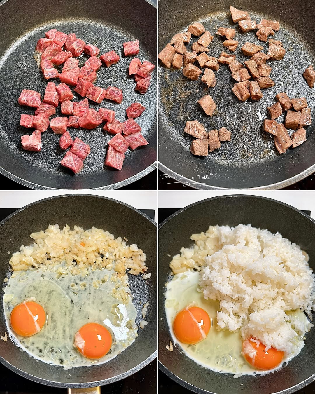 - 三文魚粒用廚房紙印乾水份,灑上鹽和黑胡椒碎;下油開鍋,煎至表面焦香,盛起備用。