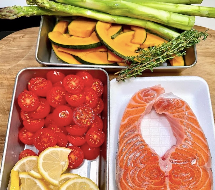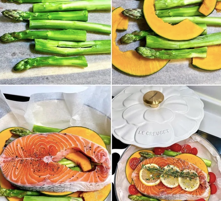 - 淺底鍋放上烘焙紙,按次序鋪上蘆筍、日本南瓜、三文魚扒和檸檬片;加入車厘茄,淋上橄欖油和蜜糖,灑上鹽、黑胡椒碎;放上百里香