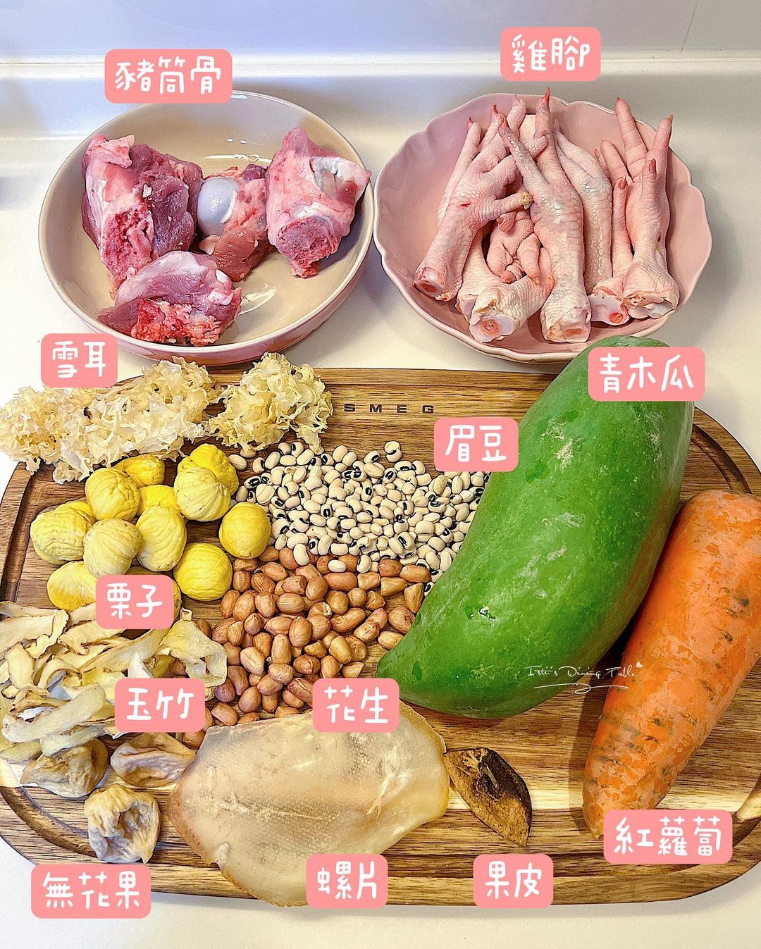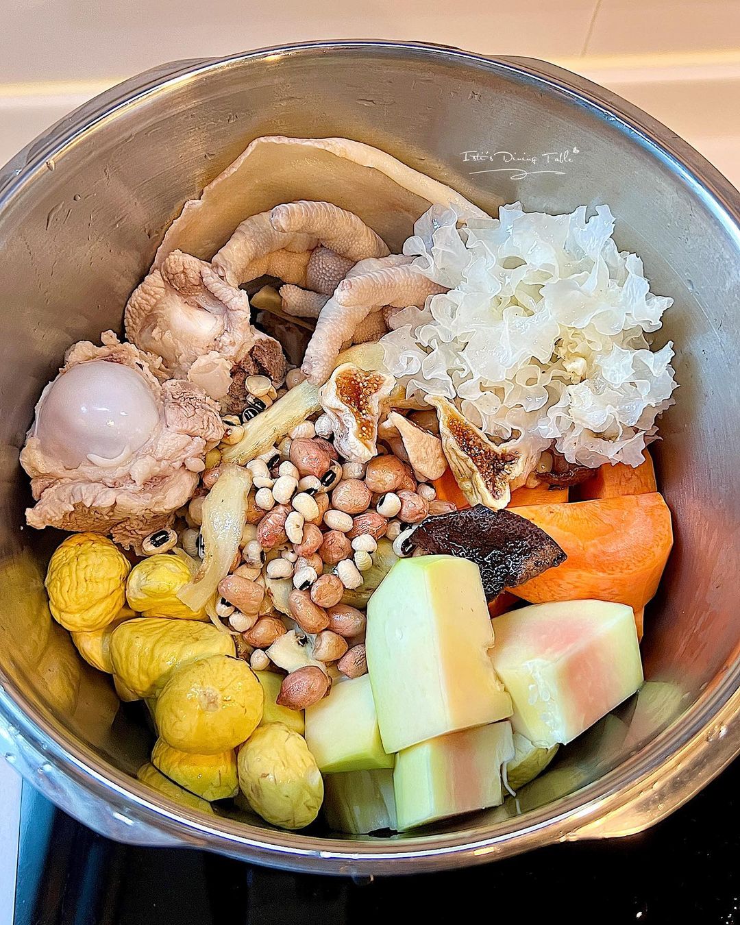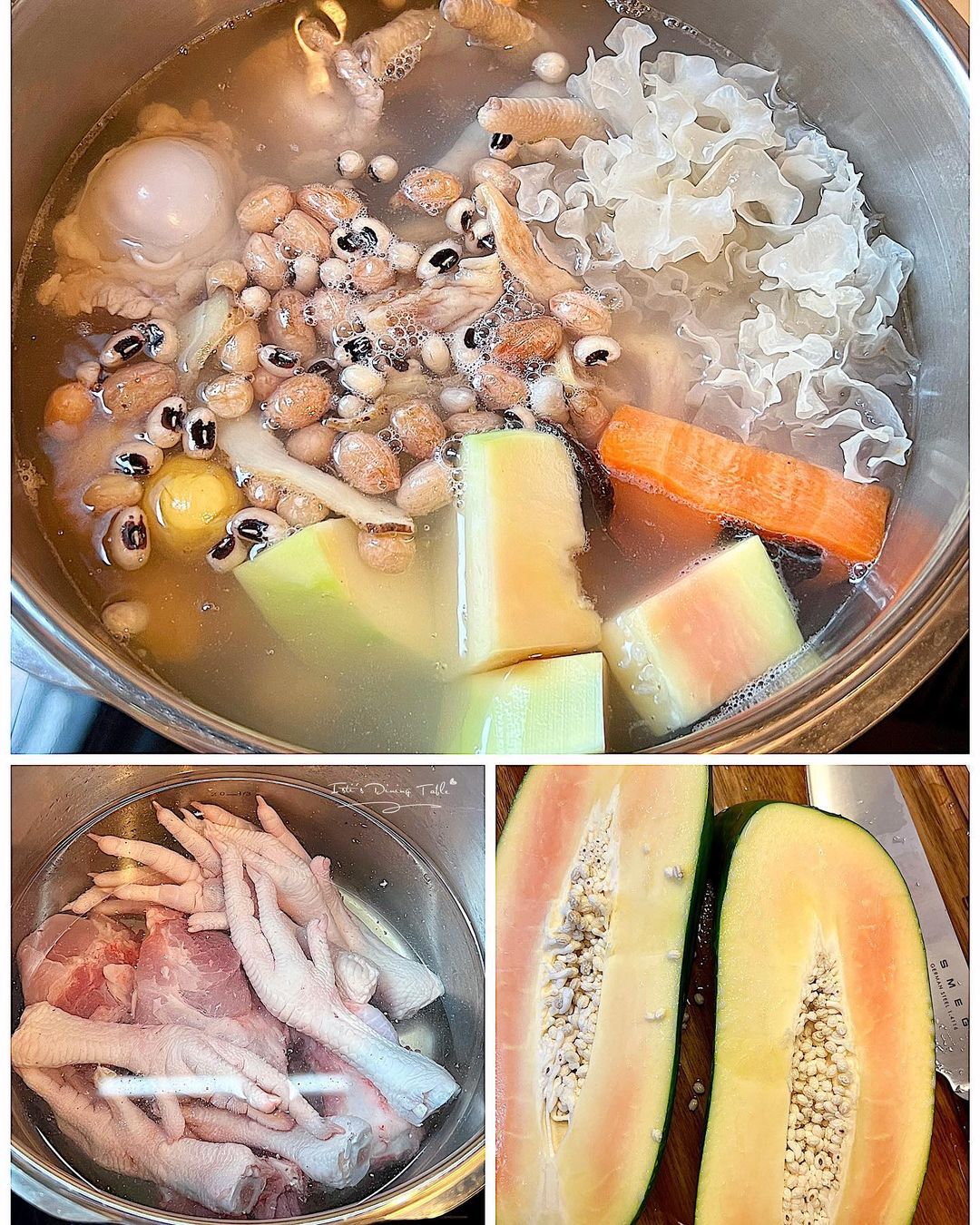 材料:青木瓜 1個去皮切件、栗子 12粒、豬筒骨 1條約600g斬件、雞腳 8隻、螺片 2塊、紅蘿蔔 1條去皮切件、雪耳 1個、玉竹 15g、花生 70g、眉豆 60g、無花果 3粒、果皮 1小塊去囊、水 2000ml