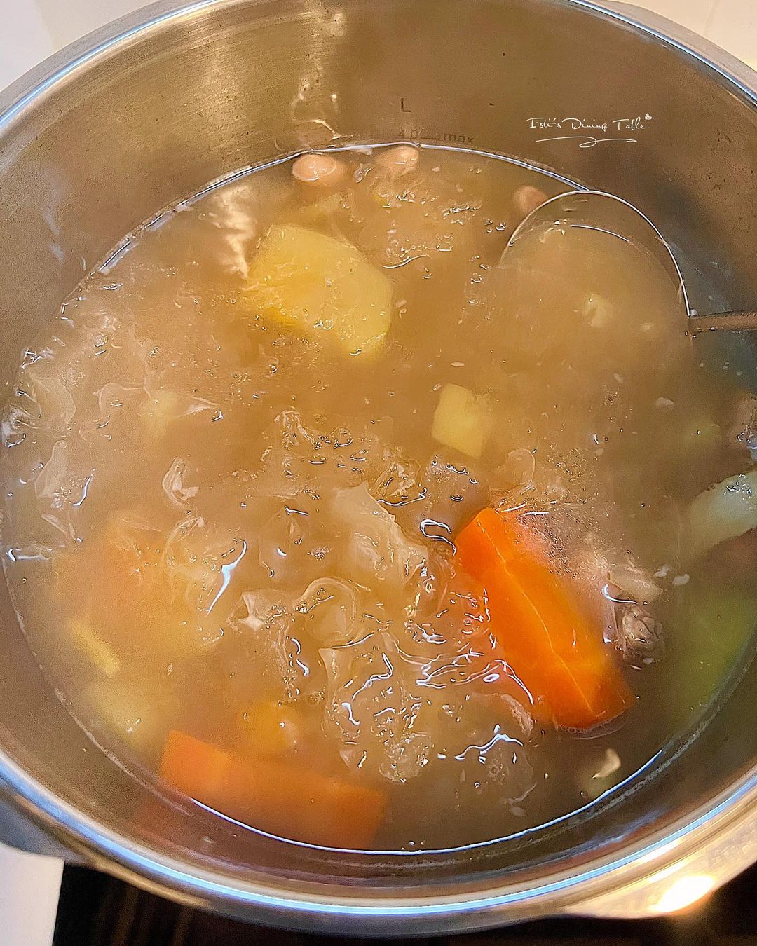 - 除花膠外,全部材料放入大鍋,煮沸後合蓋小火煮2小時。