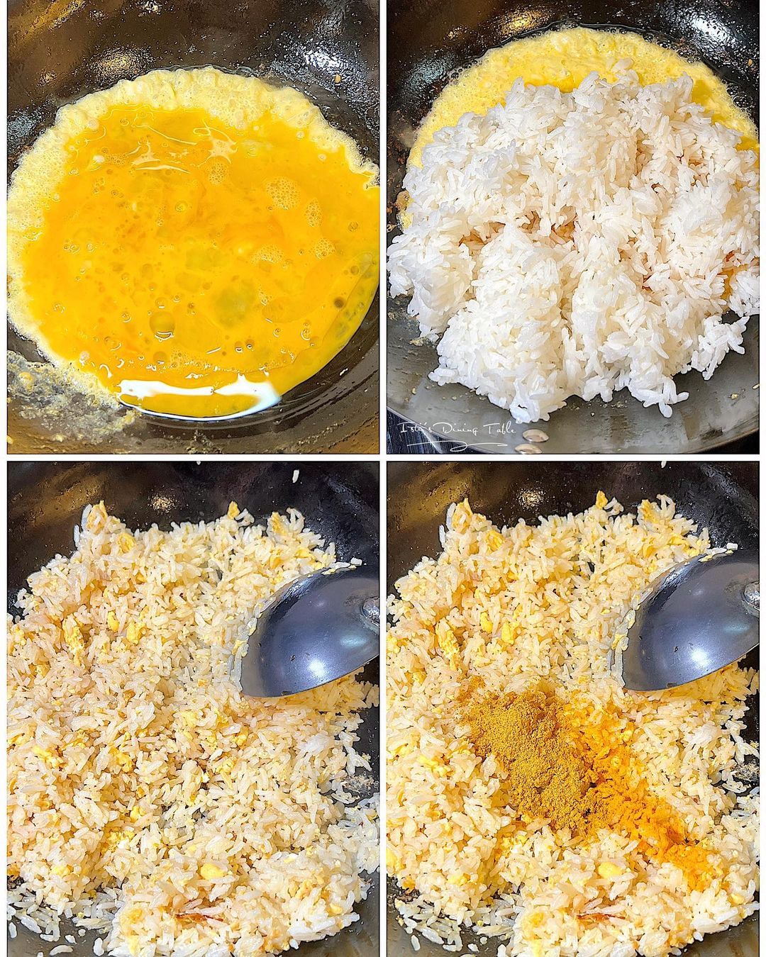 - 2隻蛋拌勻,加入鹽和胡椒粉;下油開鍋,加入白飯,倒入蛋漿炒至每粒米飯都沾滿蛋汁,加入調味料和配料炒勻,最後加入菠蘿肉。