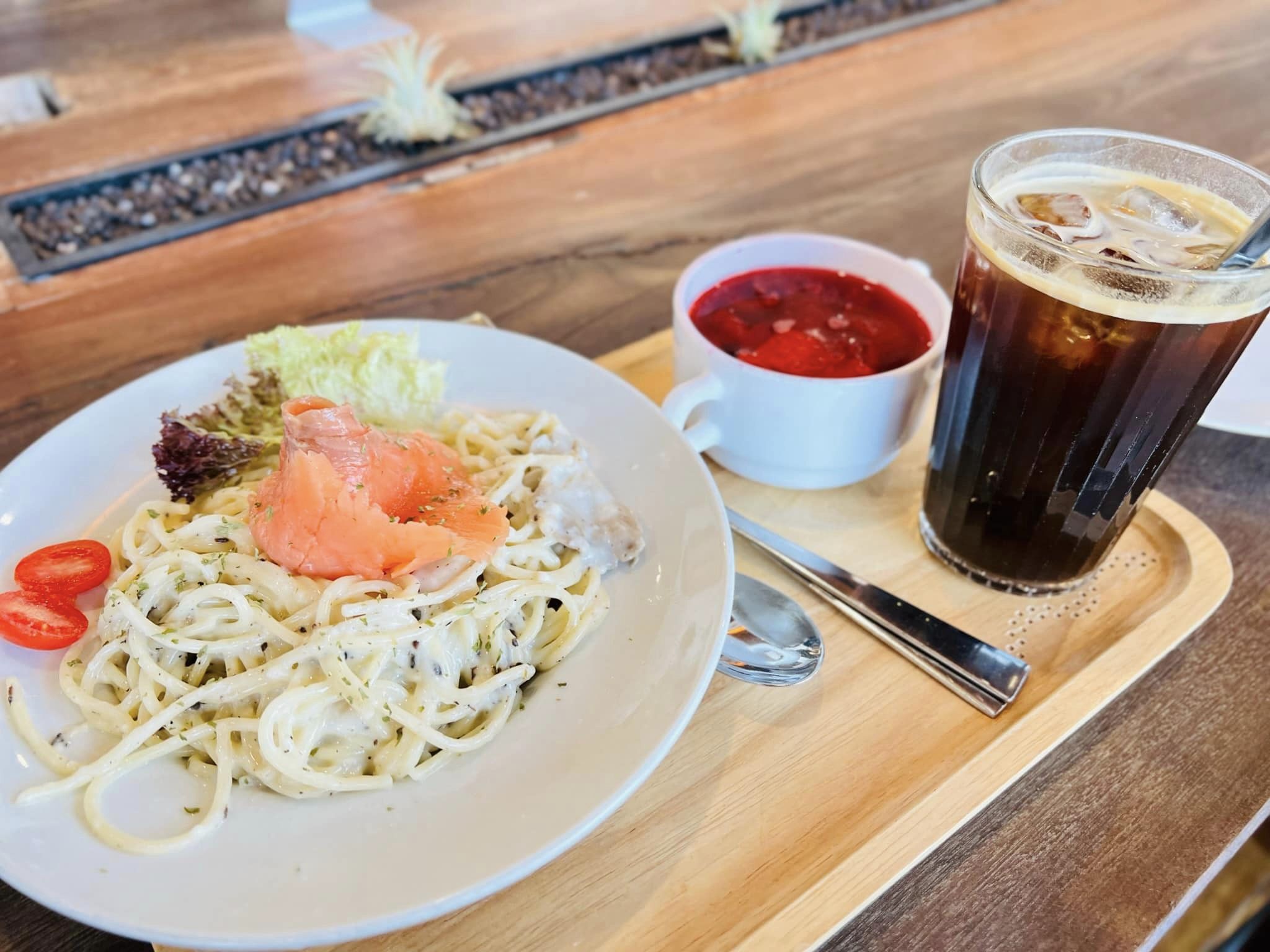 番茄沙律:4 顆蔥、1束新鮮香菜、1湯匙紅酒醋、5個大的雜色西紅柿、小菠菜50g
