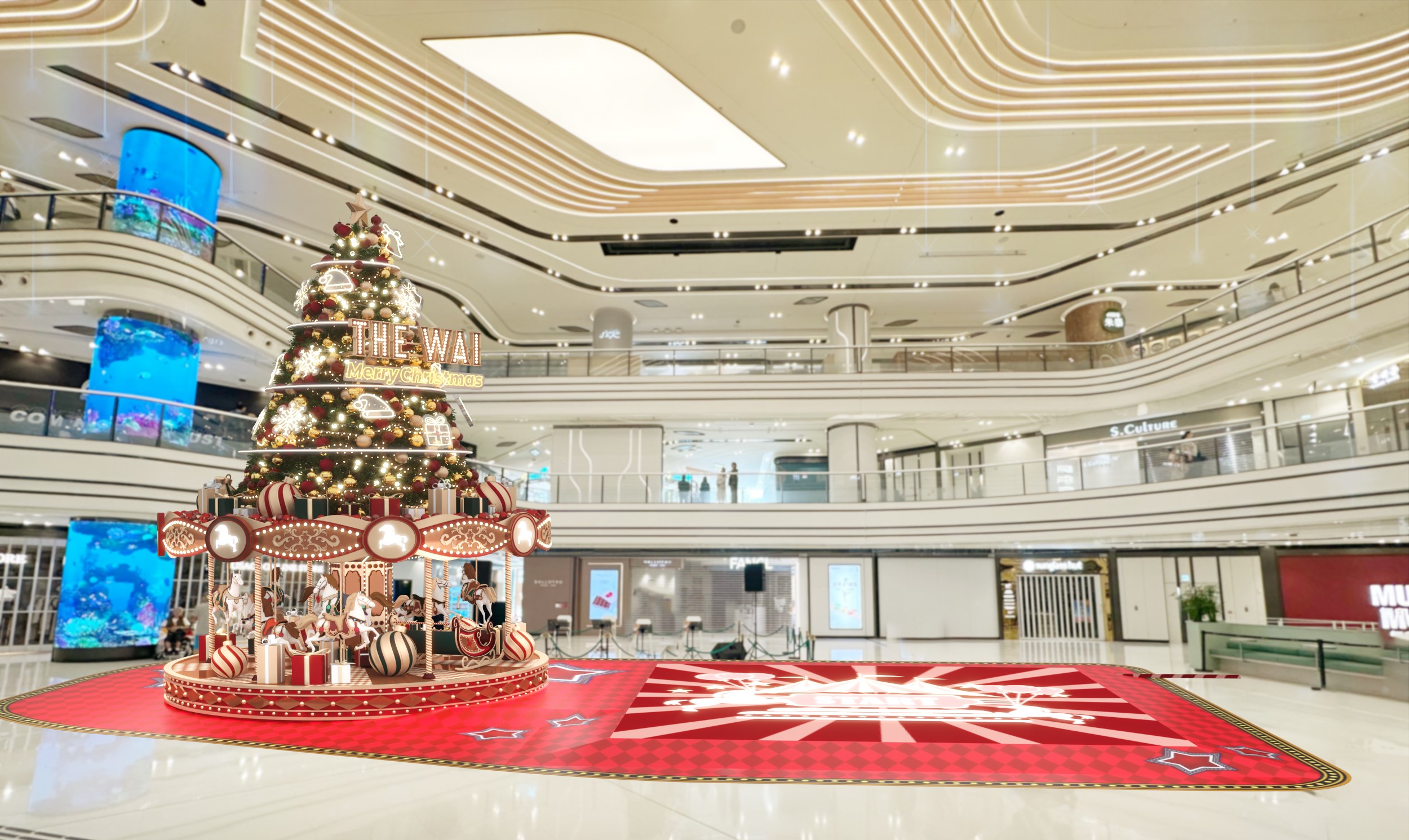 圍方《聖誕動感嘉年華》:9米高旋轉木馬聖誕樹。在12月的周末及公眾假期,圍方的戶外園藝花園還會有飄雪燈影匯演