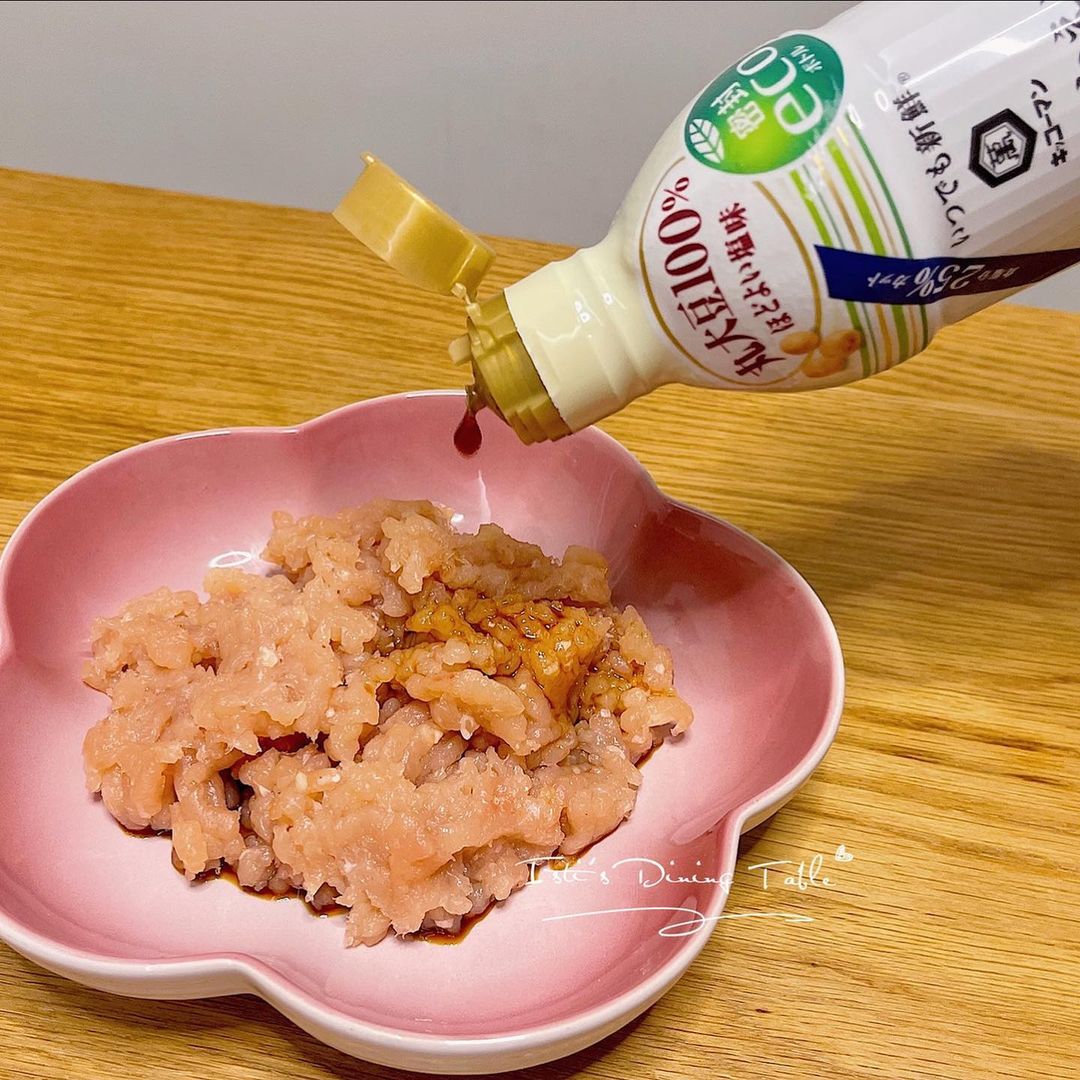 - 免治雞肉加入雞肉丸調味料,攪拌至起膠,搓成圓球狀