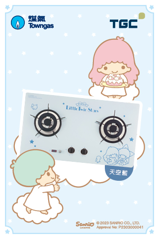 TGC x Little Twin Stars煮食爐採用嵌入式設計,配上薰衣紫和天空藍兩款全新夢幻色彩,令你煮食時猶如置身星之國度,強化玻璃面印有不同的Kiki和Lala圖案,時刻伴你煮食。除了外型吸引,爐具更具備TGC煤氣煮食爐一貫的高效性能,火力高達5千瓦,特強火力令你煮任何菜式均鑊氣十足;密封式爐頭設計,清潔時既方便又容易打理。